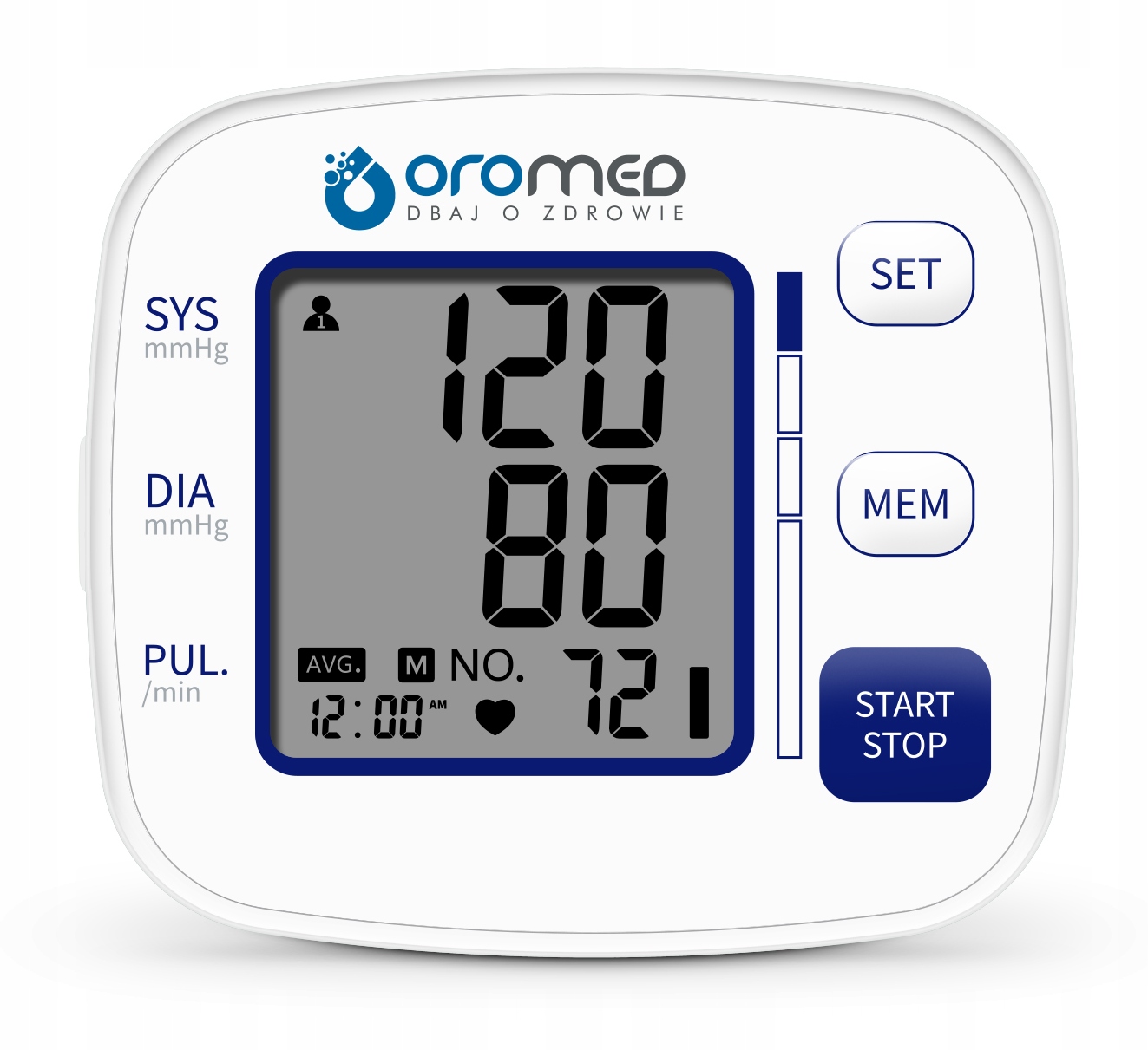 OROMED ORO-BP SMART — це повністю автоматизований пристрій для вимірювання артеріального тиску та частоти серцевих скорочень, який носить на зап’ясті. Пристрій простий у використанні і ідеально підходить для щоденних вимірювань. Чіткий дисплей дозволяє легко зчитувати систолічний, діастолічний і пульсовий тиск після кожного вимірювання.