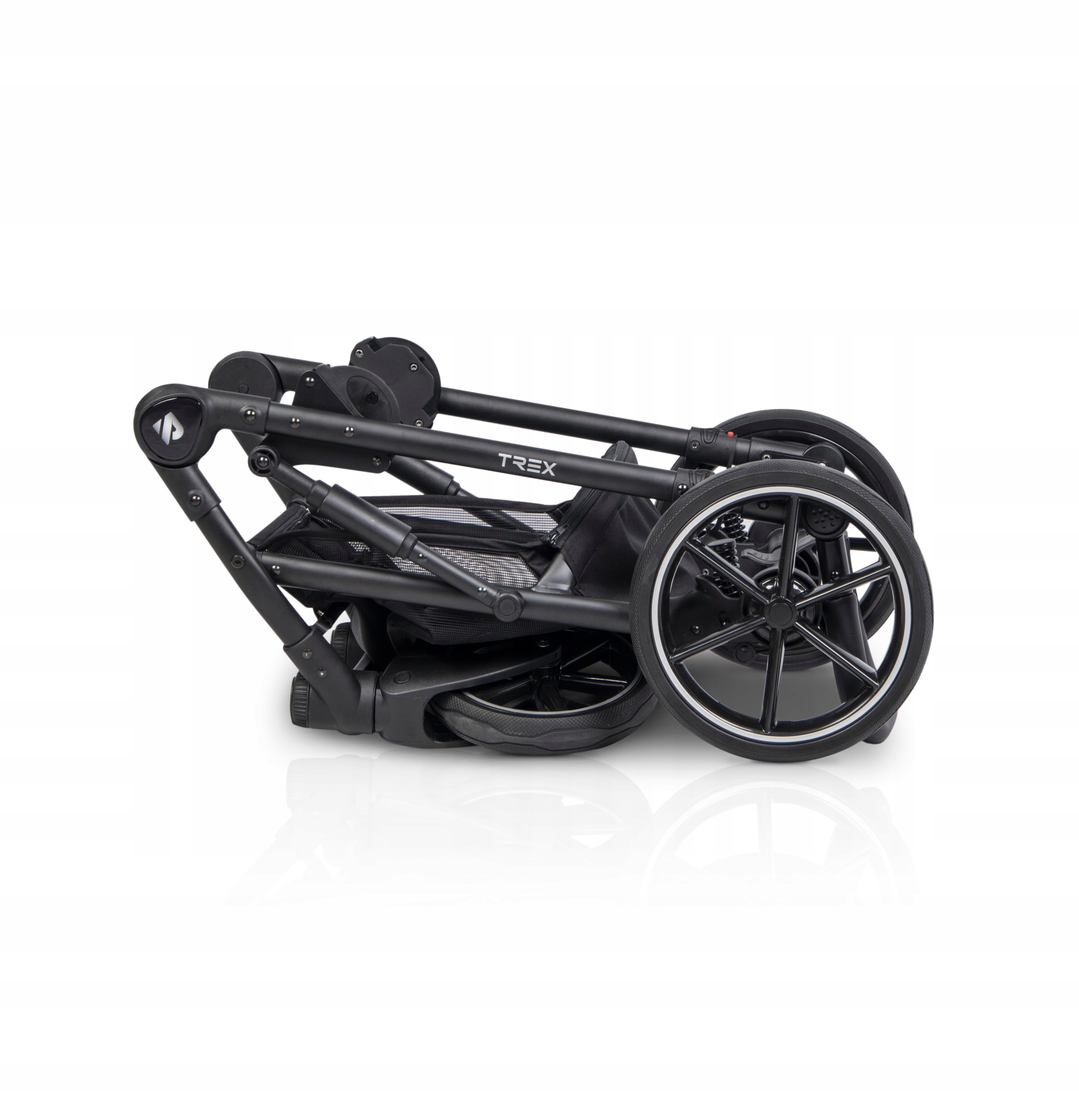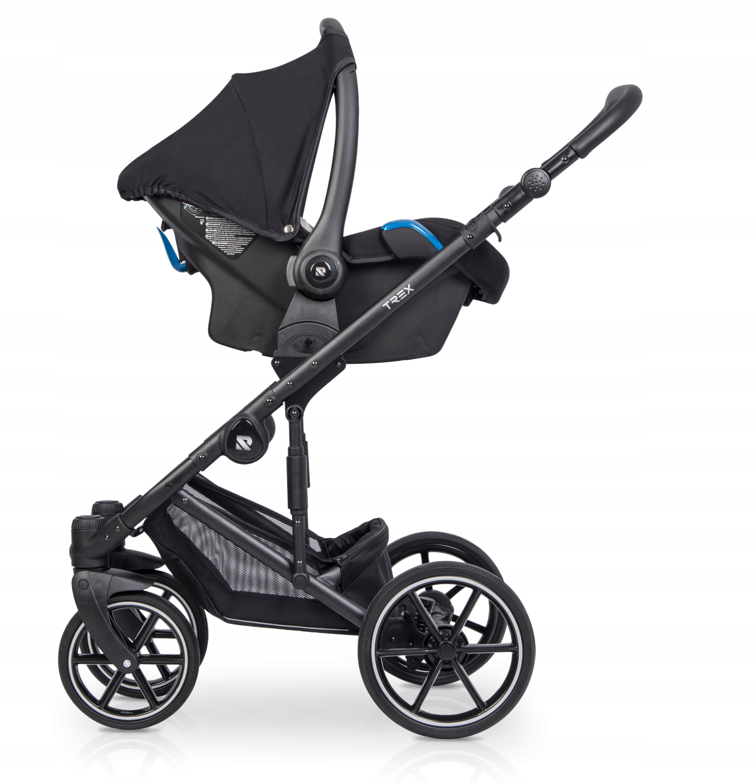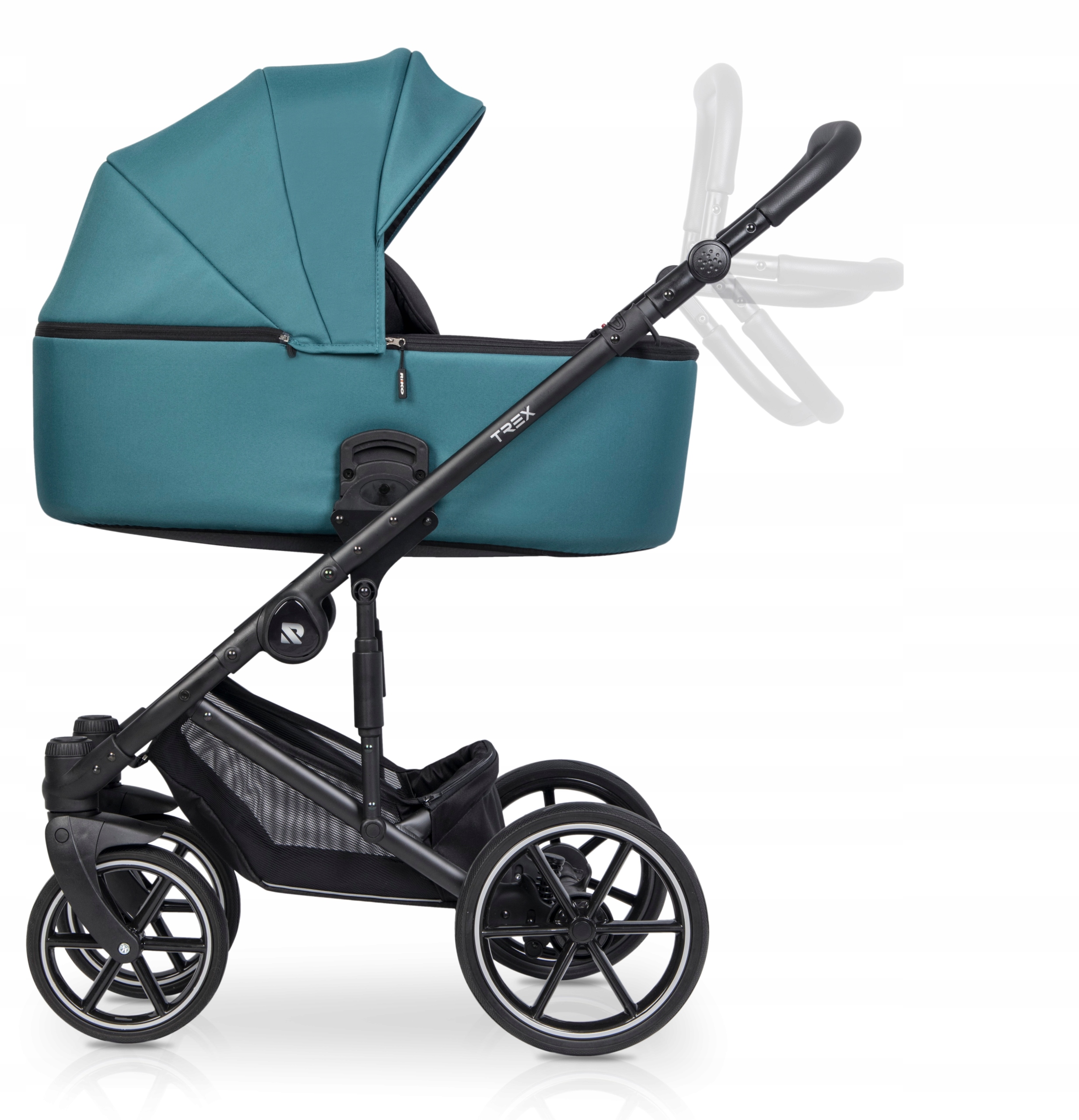 Люлька для коляски Trex велика та зручна. Має регульовану висоту спинки, що дуже практично при їзді коляски під гору (завдяки цьому ви уникнете ситуації, коли голова дитини знаходиться нижче ніг). Сонцезахисний навіс має безшумне регулювання, тому дитина не прокинеться від шуму регулювання. Кришка гондоли також була зроблена з урахуванням сплячої дитини, а її кришка кріпиться магнітами. Всередині бавовняна підкладка та поролоновий матрац.