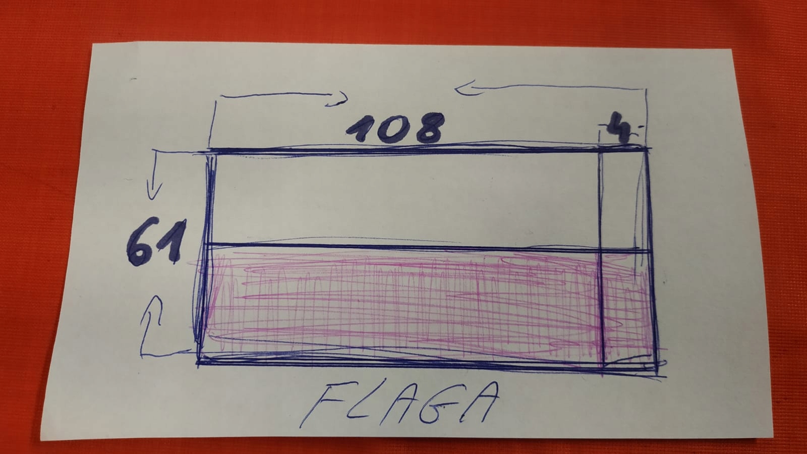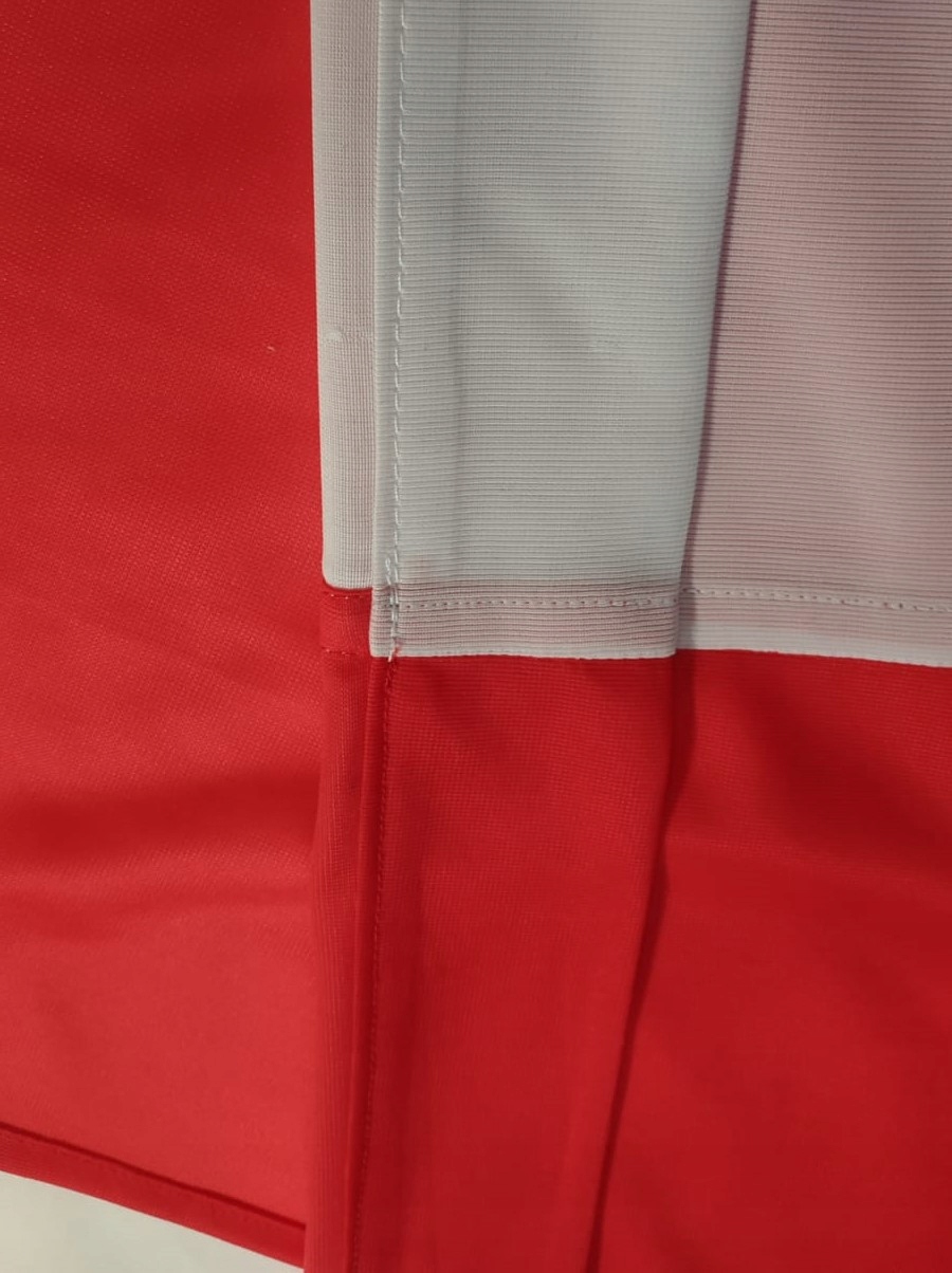 Прапор з трьох боків подвійний, загорнутий матеріалом і оброблений сильними нитками. Прапор має 4 см на дереві, пришивши зверху.