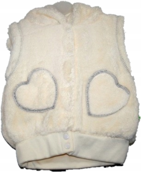 Жилет з капюшоном. Зроблено з кремового волосистого покуру. На передній частині пришиті 2 кишені у вигляді сердець. Кріплявся по всій довжині. Внизу Welt.