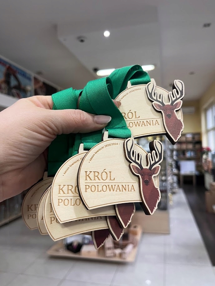 The subject of sale is A wooden hunting medal with any description - at this auction you buy 1 piece of a medal with any description and a roeed motif and a ribbon, other animals available at our other auctions