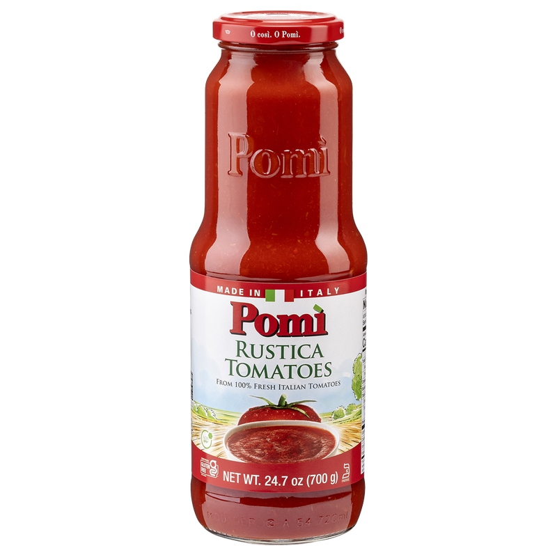 Passata RUSTICA має домашній характер томатного пюре, що нагадує автентичні оригінальні рецепти, оскільки зберігає всі характеристики свіжих помідорів, включаючи шкірку та насіння. Унікальна текстура свіжих помідорів, запечених, очищених від шкірки та дренованих, залишає смачну та дуже ніжну м’якоть, ідеальну для соусів, піци та брускетти або як основу для традиційних рецептів.