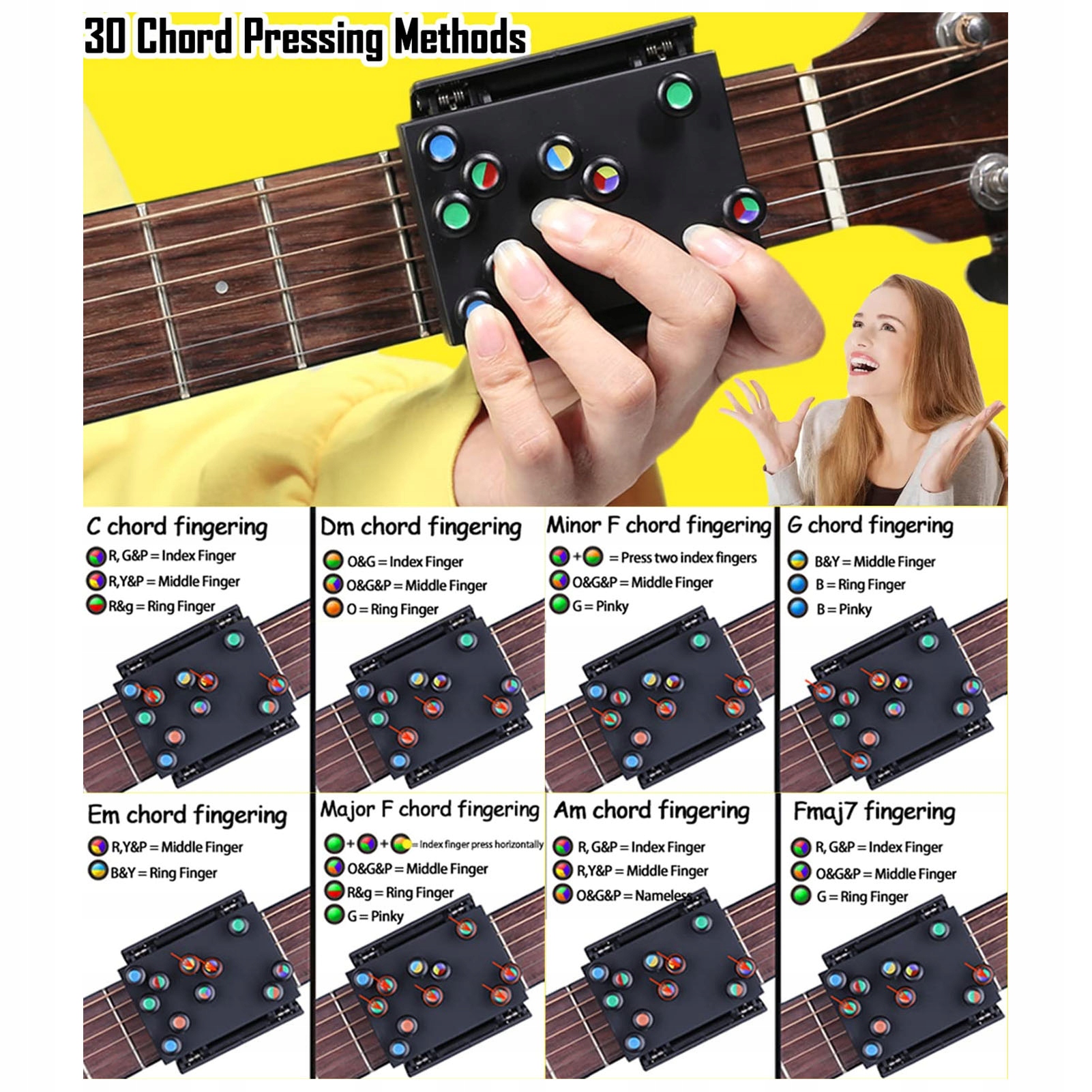 1、[Кілька аранжувань акордів] Guitar Chord Helper містить до 30 аранжувань акордів, що охоплює 99% пісень, що робить його універсальним інструментом для гітаристів. 2、[Легко навчитися] Грайте певні акорди, просто натискаючи відповідні кольорові кнопки. Цей інструмент для вивчення акордів на гітарі полегшує розуміння та запам’ятовування акордів, не травмуючи пальці, ідеально підходить для початківців. 3, [Кілька функцій] Інструмент для гітарних акордів допомагає прийняти правильну поставу, тренувати м’язову пам’ять рук, покращувати ефективність переходу акордів, сприяючи більш плавній грі. 4、[Просте налаштування] Просто прикріпіть допоміжний інструмент для акордів гітари на гриф гітари, щоб використовувати його. Конфігурація проста і не вимагає складних процедур. 5、[Універсальне використання] Тренажер, розроблений для класичних, народних або електрогітар діаметром від 36 до 41 дюйма та довжиною струн менше 4,5 см, є універсальним інструментом для різноманітних гітар.