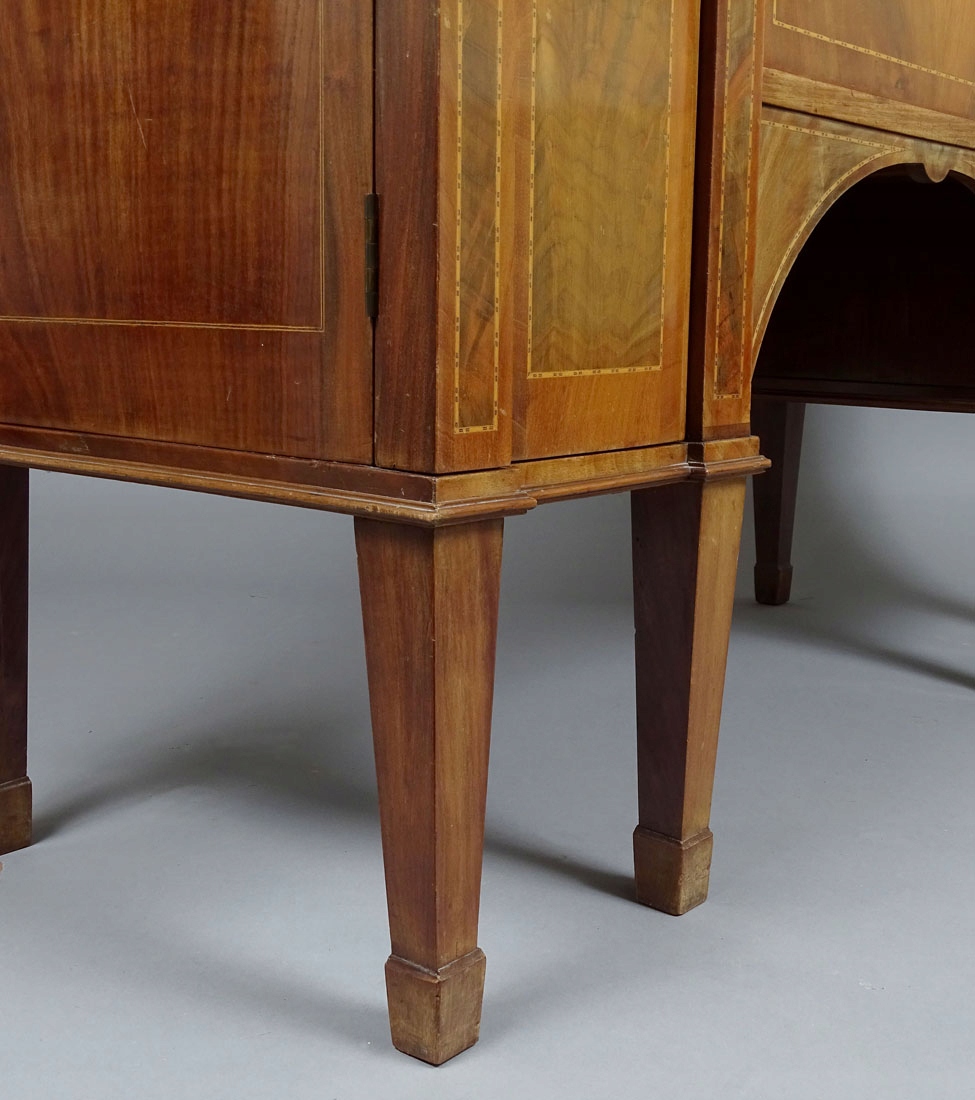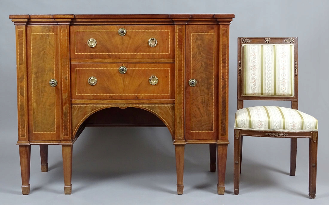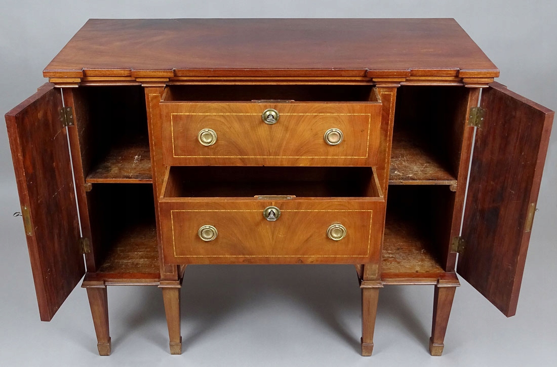 простого дизайну, з парою дверцят з боків і двома висувними ящиками посередині, що підтримується шістьма кутовими полицями, чотирма спереду і дві ззаду, ноги звужені донизу. Форма стільниці відповідає конструкції меблів, з витонченою фаскою по периметру. На гранях шухляд і дверцят є делікатні вставки з подвійно укладених дерев’яних ниток. Двері та ящики з латунною фурнітурою та ящиками та сталевими врізними замками з ключами, дві полиці всередині.