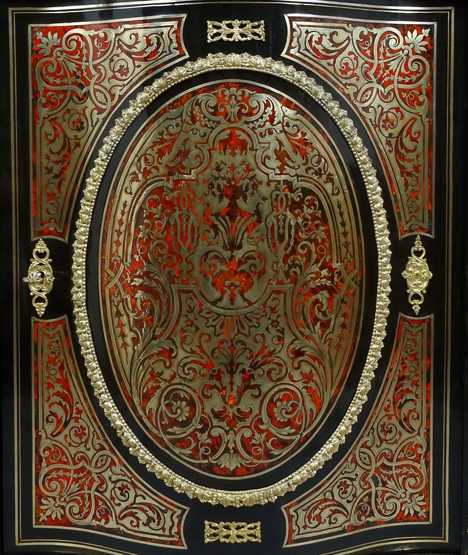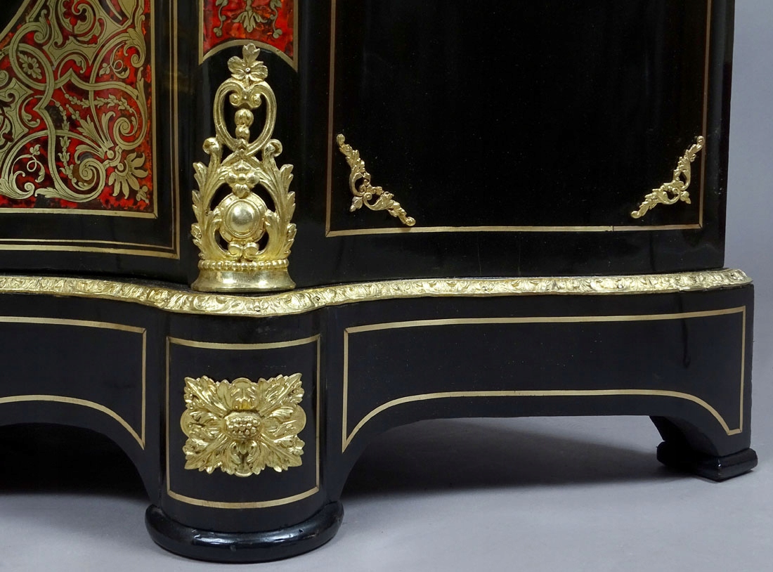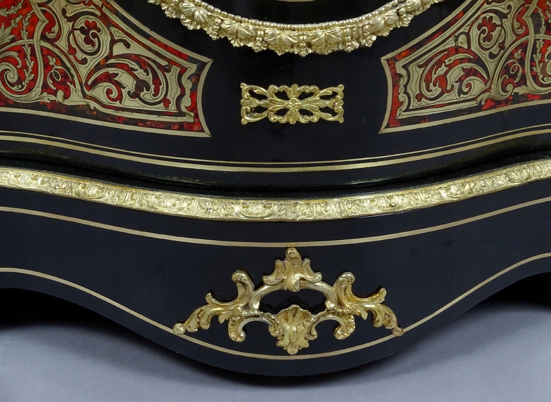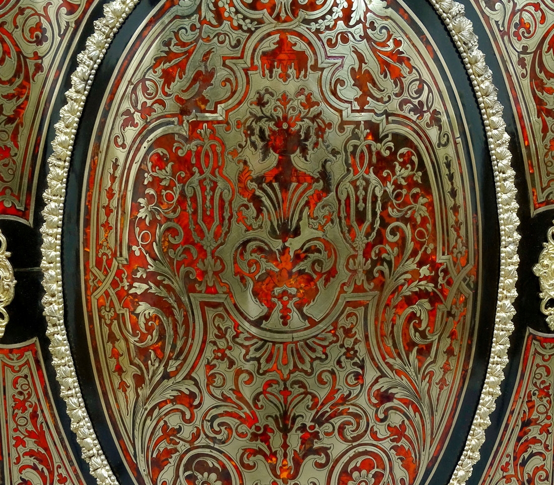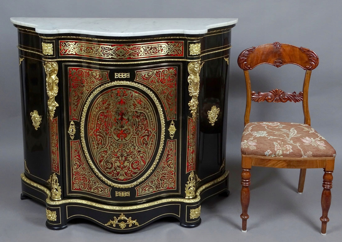 Дубова структура, шпон червоного та чорного дерева, черепаховий панцир та латунний лист маркетрі, бронзова фурнітура, мармурова верхня частина, оригінал, кінець 19 століття.