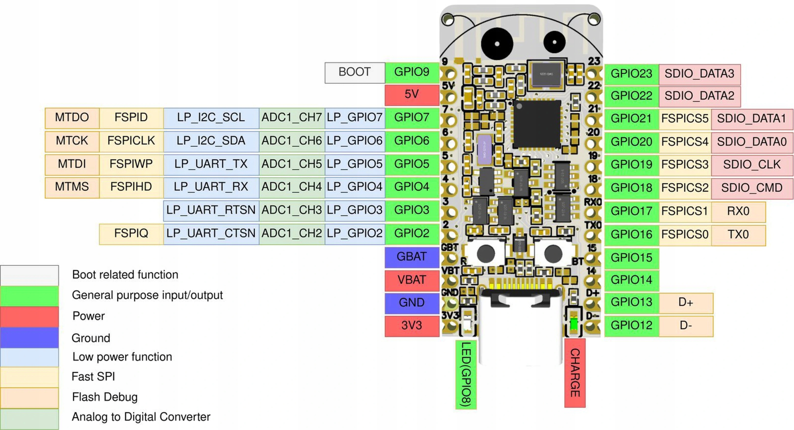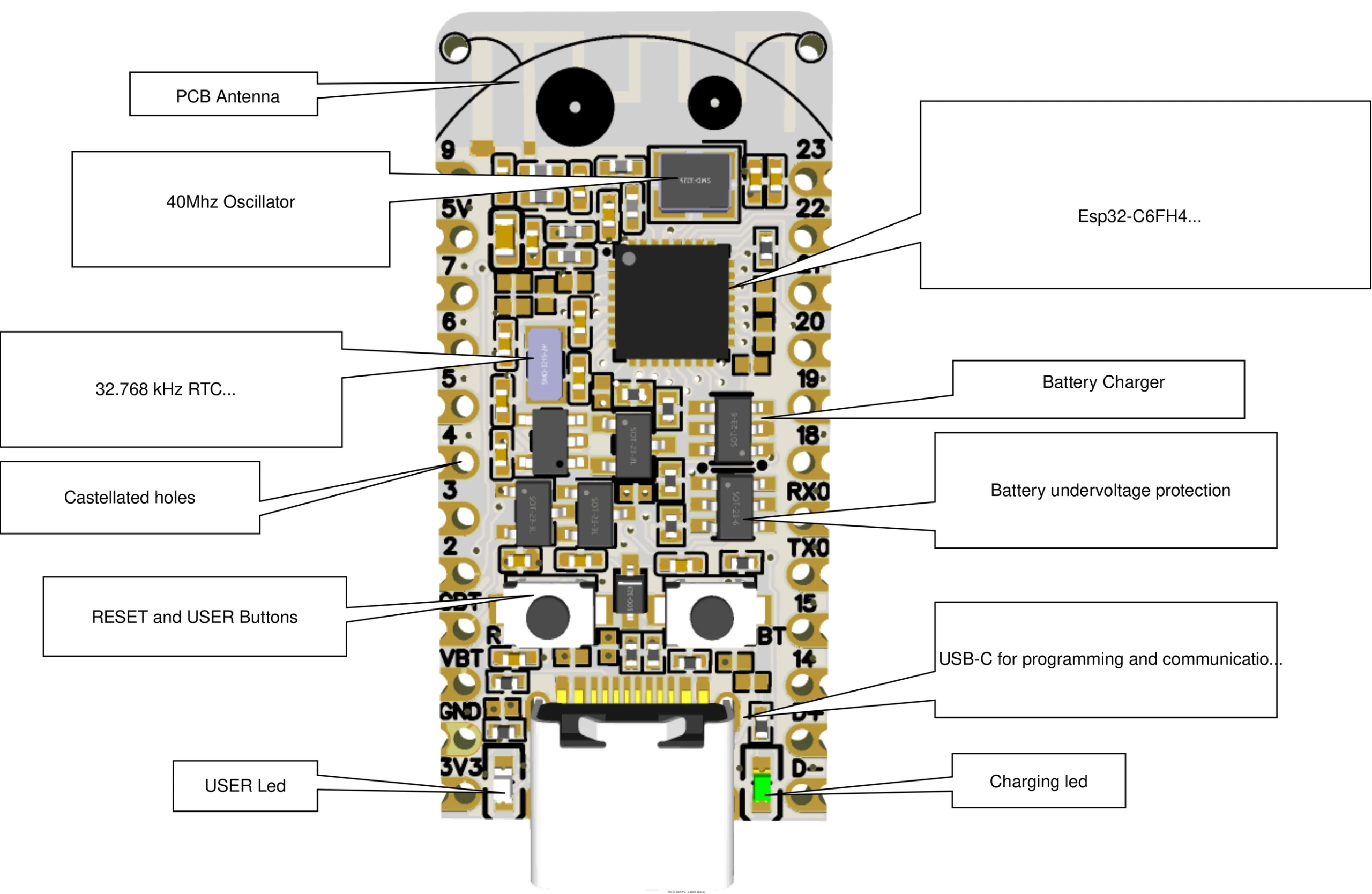 ESP32-C6-BUG-це невелика розробка пластини ESP32-C6FH4, яка підтримує кілька бездротових протоколів, таких як Wi-Fi 6, Ble 5, Thread або Zigbee. З низьким споживанням енергії та робочим часом акумулятора, плата ESP32-C6-BUG ідеально підходить для проектів з необхідністю бездротового спілкування та високої ефективності струму.