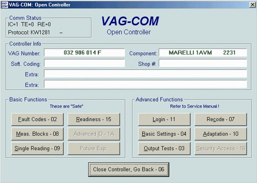 Після підключення до контролера ви можете вибрати основні функції, які вас цікавлять (наприклад, зчитування кодів несправностей, блоки вимірювань, одиночне зчитування) або розширені функції (наприклад, кодування, базові налаштування, адаптація приводів, тестування приводів).