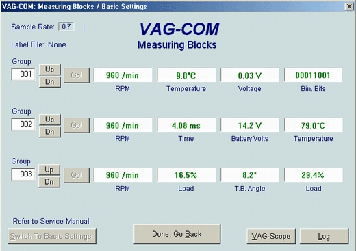 На малюнку нижче показано роботу функції «Вимірювальні блоки». Автомобіль на діагностиці Skoda Octavia 1.6 99 р.в. Таким простим способом ви можете перевірити кожен автомобіль VAG. Просто сядьте в машину, увімкніть програму і зробіть тест-драйв, спостерігаючи за поточними параметрами роботи.