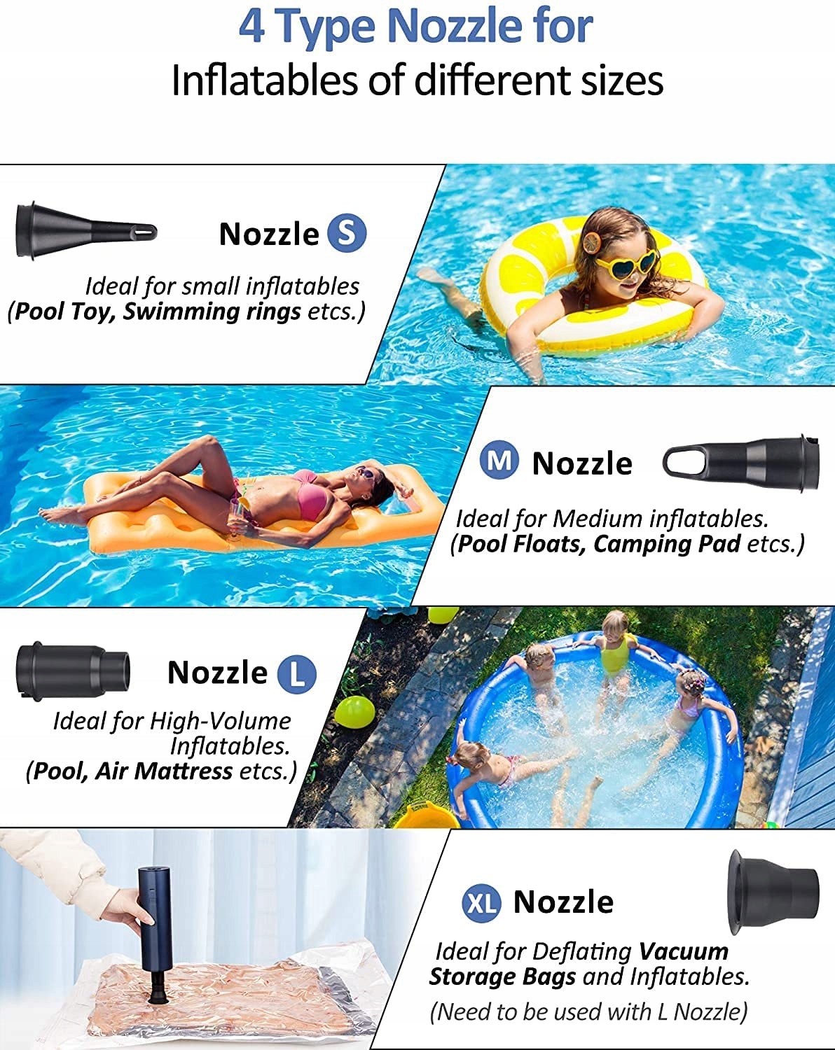 Цей надувний матрац із повітряним насосом має 4 розміри насадок, ідеально підходить для надувних басейнів/човнів/іграшок/надувних замків, надувних матраців/ліжок/диванів / байдарки, стрибучий м’яч і вакуумні пакети.