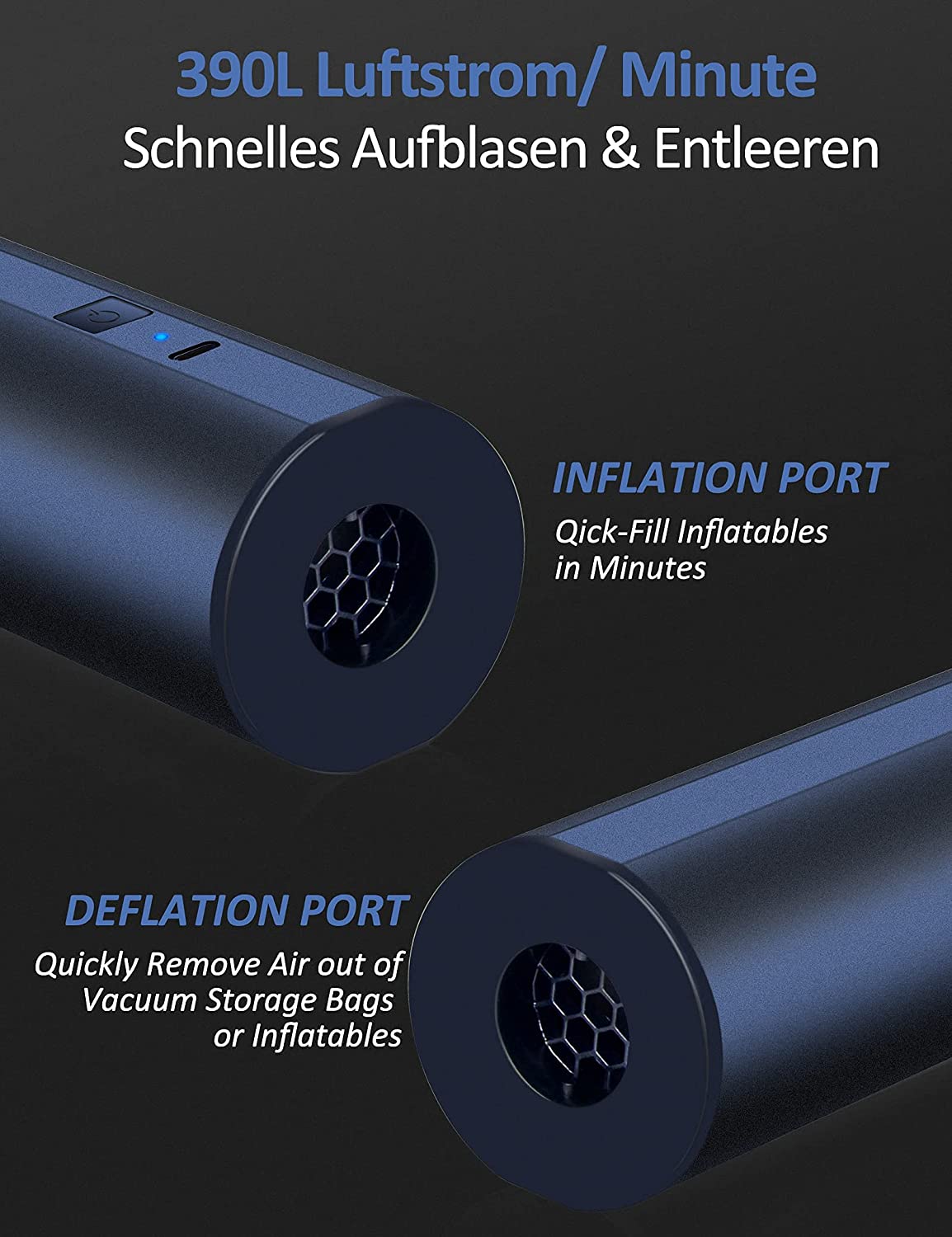 Насос з витратою 390 л/хв. Потрібно лише близько 20 секунд, щоб накачати кільце для плавання, 1 хвилина, щоб наповнити надувний матрац, 3 хвилини, щоб накачати дитячий басейн, 1–2 хвилини, щоб стиснути вакуумний мішок для зберігання