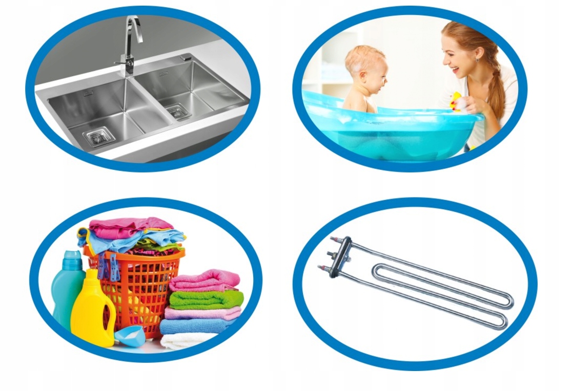 - Кухня та ванна кімната: чайник без накипу, блискучий посуд і до 45% менше споживання чистячих і миючих засобів, збільшений термін служби та менший ризик виходу з ладу побутової техніки: посудомийної машини, пральної машини, кавоварки; сантехніка без осаду, плям і смуг, набагато коротша і легша чистка.