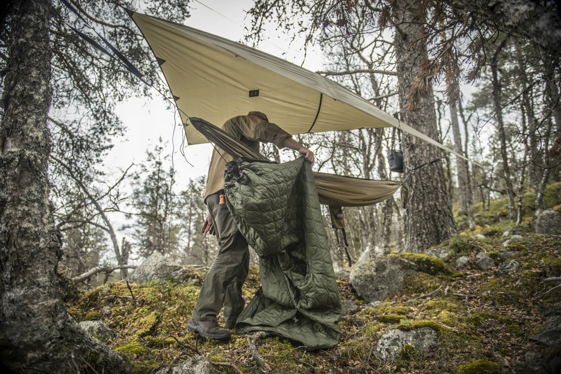 повністю виготовлений з довговічного поліестеру і наповнений товстим шаром ізоляції , гарантує ефективний захист від охолодження. Довгий замок дозволяє швидко перетворити його на імпровізований спальний мішок, ковдру або додаткову ізоляцію до гамака .