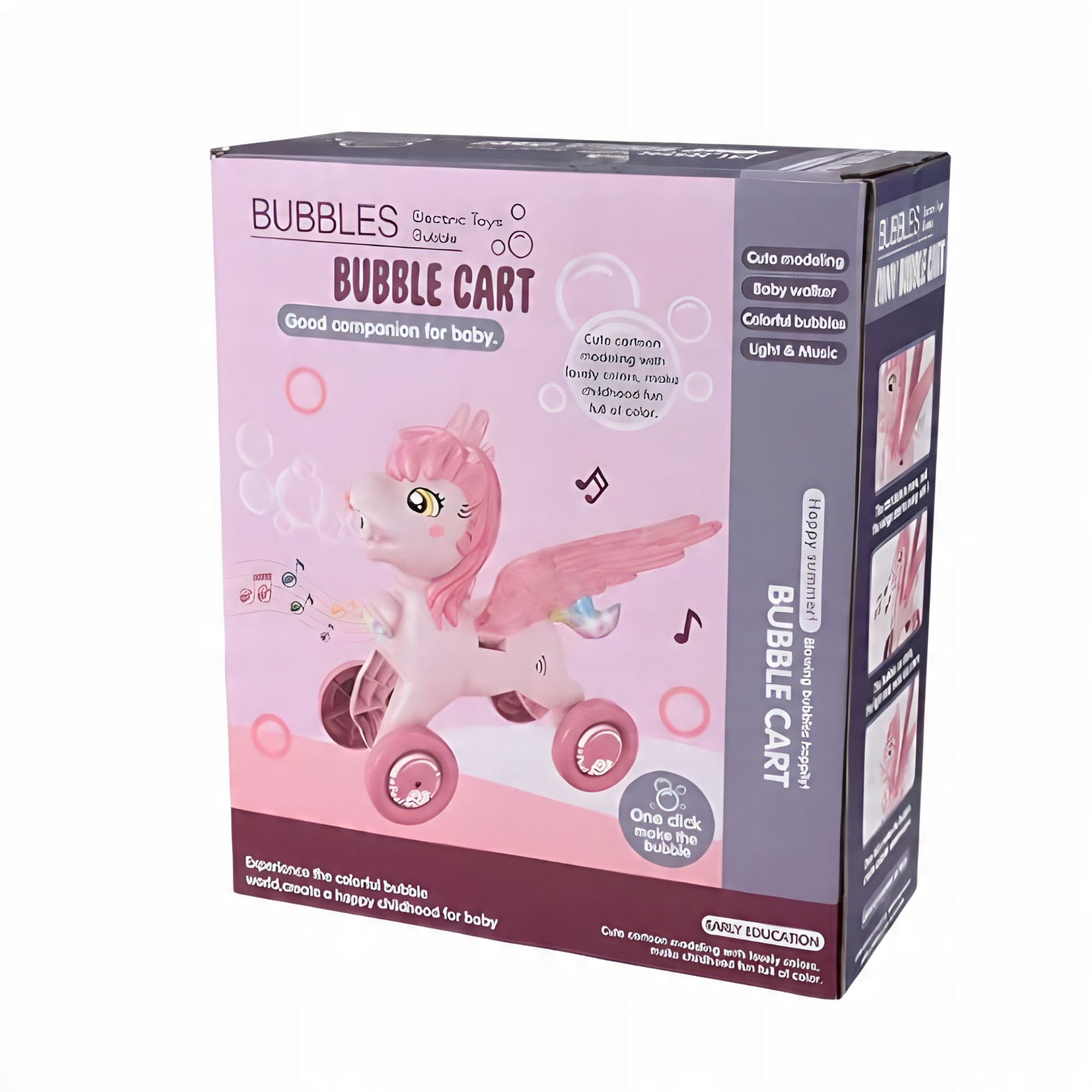 Це надзвичайна іграшка, яка поєднує в собі багато атракціонів, зокрема звукові та світлові ефекти та можливість створювати мильні бульбашки.