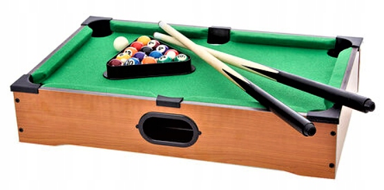 - Опис елементів: таблиця, 2 кия з крейдою, набір м'ячів з трикутник