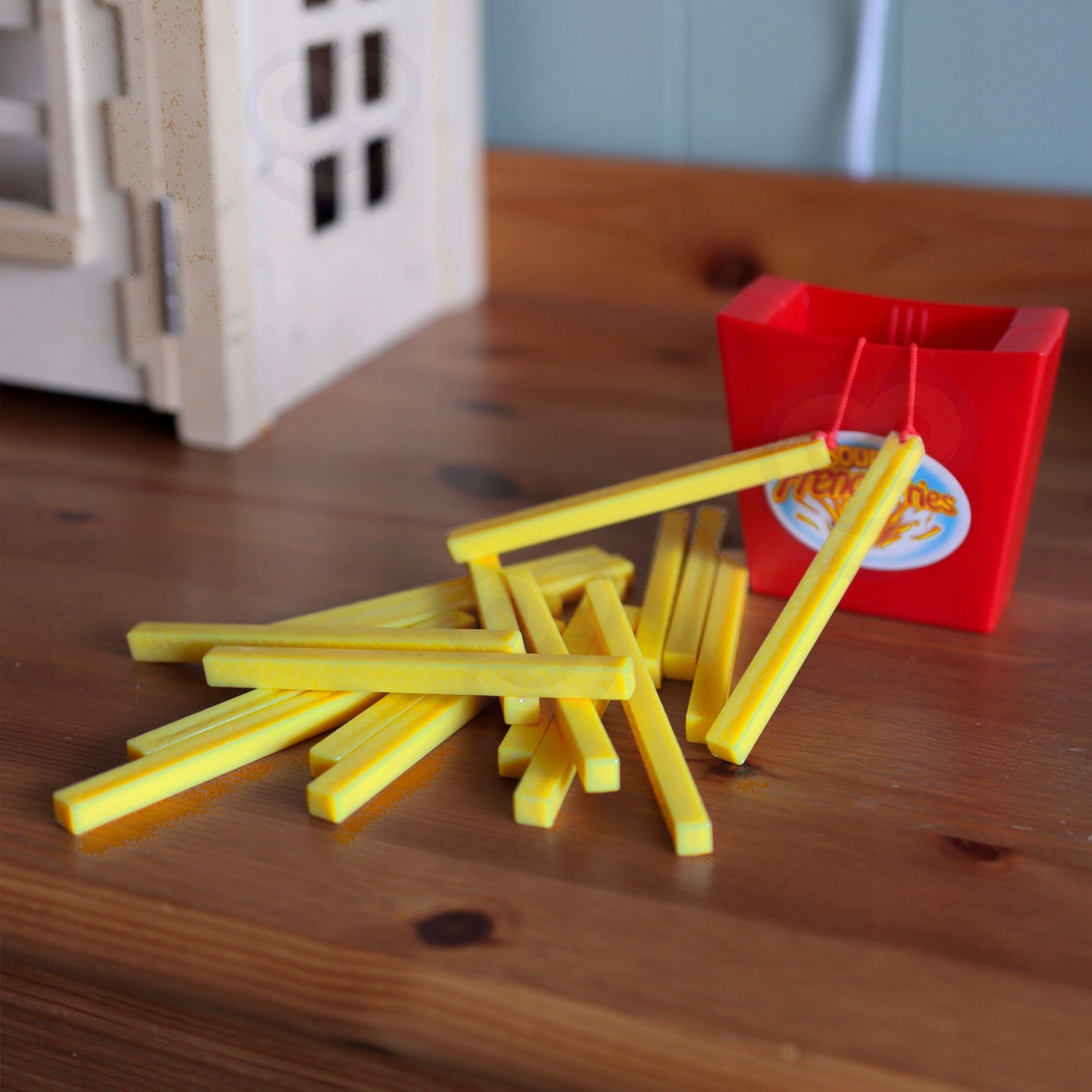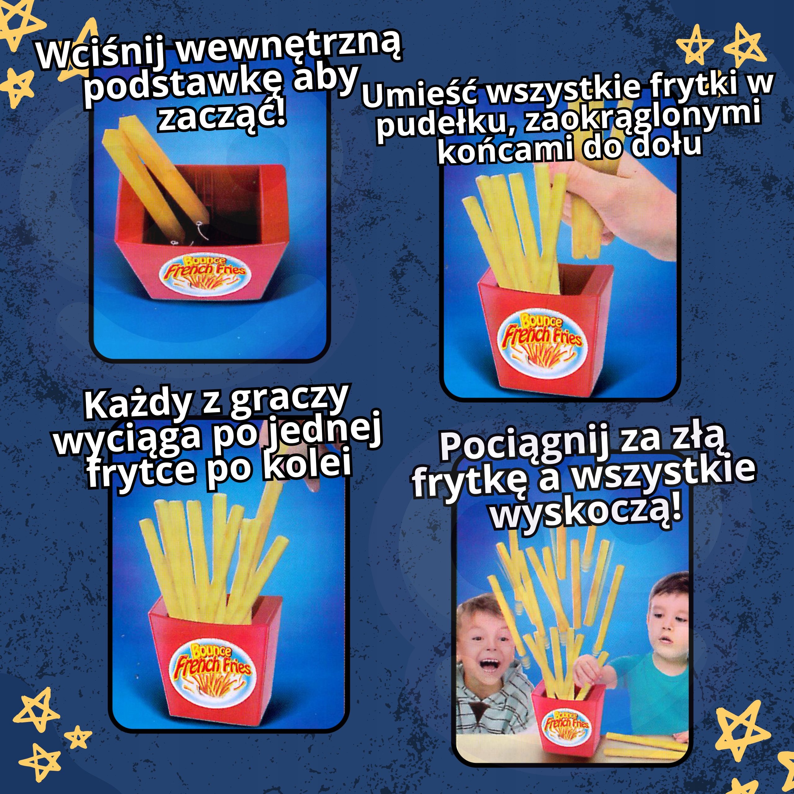 Аркадна гра спливаючі фрі Woopie -це гра для дітей з 4 років. Гра дуже проста, вона передбачає витягування правої фрі , щоб інші не стрибали з упаковки. Окрім багатьох розваг, це покращує посібник дитини та координаційні здібності . Іграшка легка і зручна. витягування фрі - це відмінна розвага для спільних вечорів з родиною чи друзями.