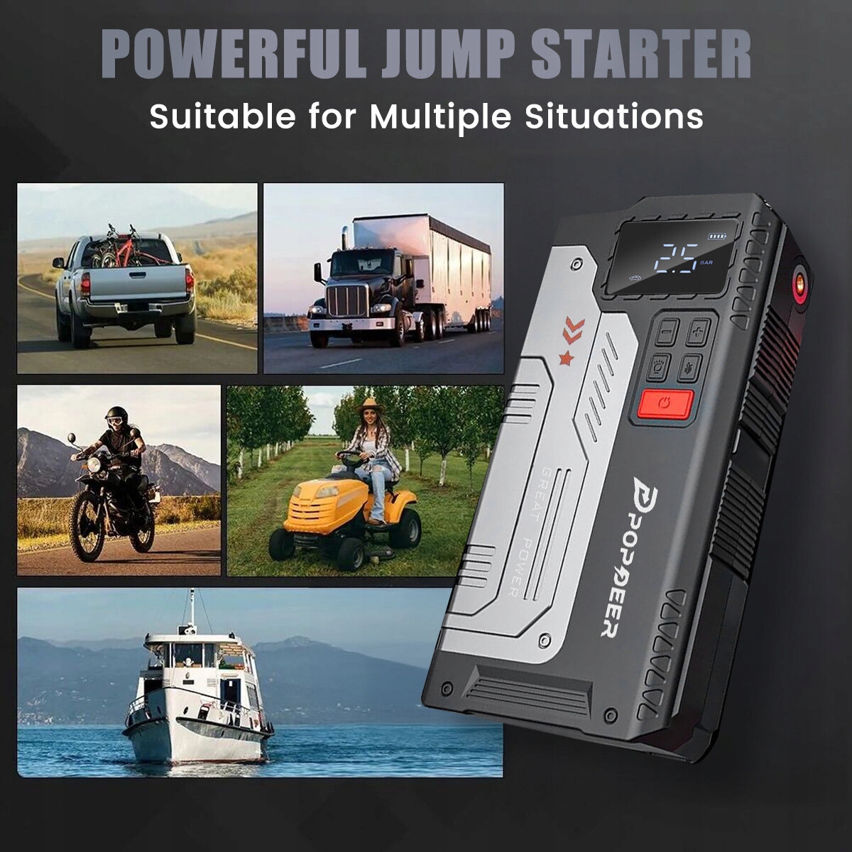 POPDEER PD-JA1 – це багатофункціональний аварійний пристрій, який поєднує в собі потужний стартер із піковим струмом 5000A та ефективний повітряний компресор. Завдяки великій ємності 20000mAh він забезпечує тривалий заряд в екстрених ситуаціях. Компактний дизайн і розширені функції безпеки роблять його необхідним інструментом для кожного водія. Основні характеристики та переваги: