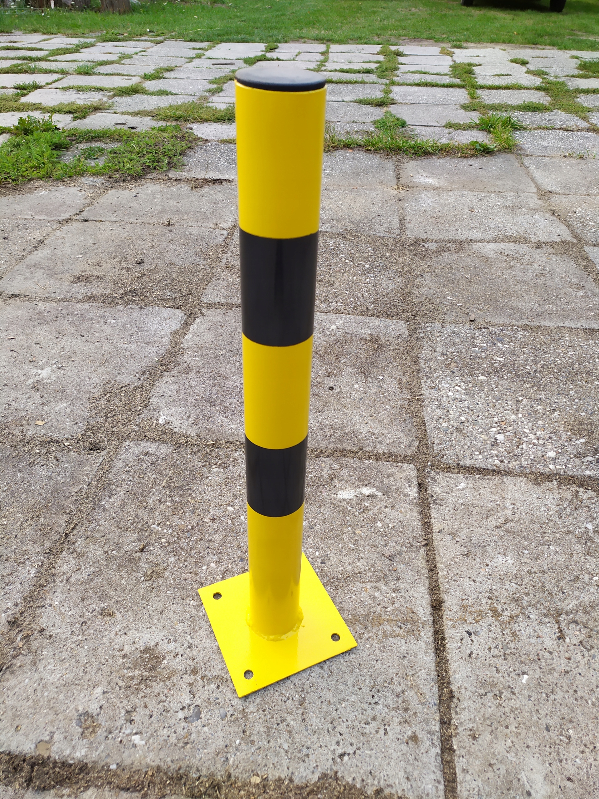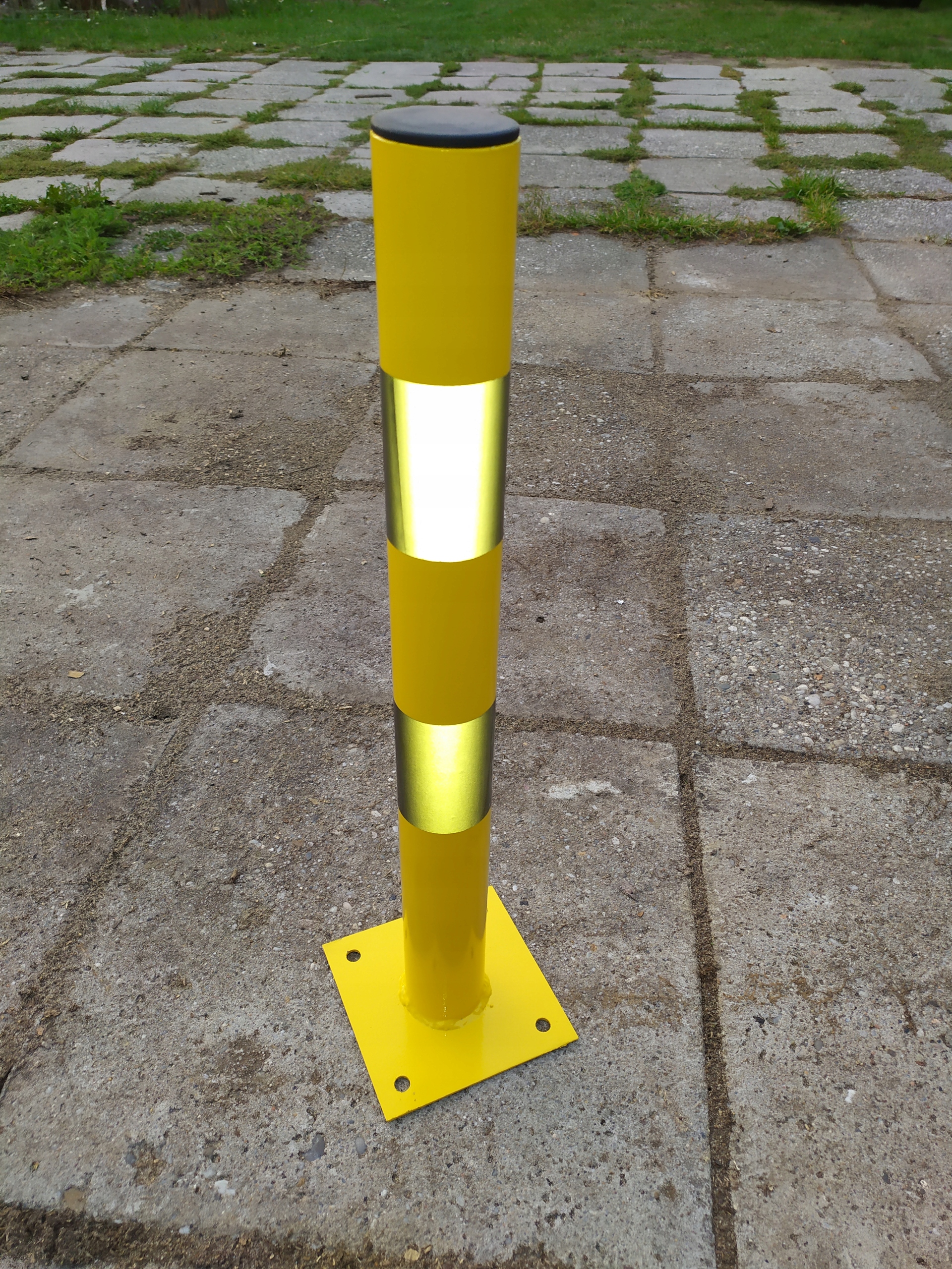 Жовта парковка з чорним відбивачем. Пости, виготовлені зі сталевої труби, на твердій основі, адаптовані для встановлення на твердій поверхні з розширенням. Труби)