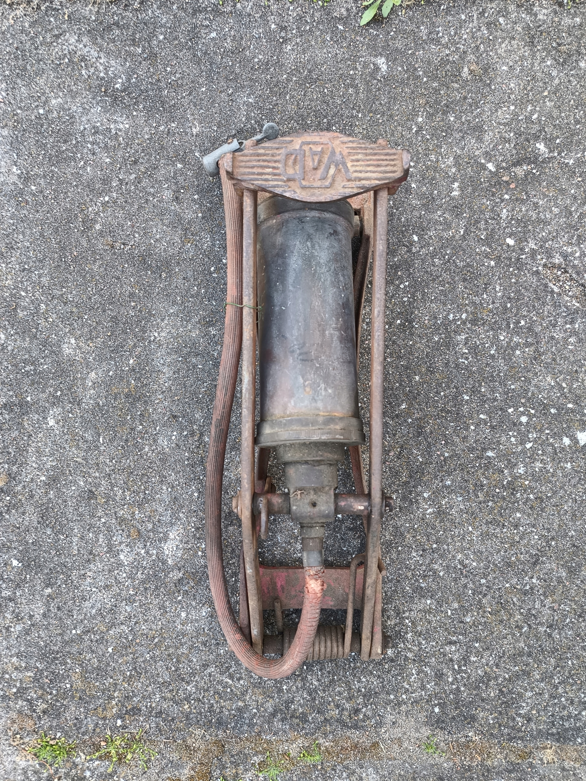 Старий історичний насос для ніг для автомобіля, підписаний w.a.d