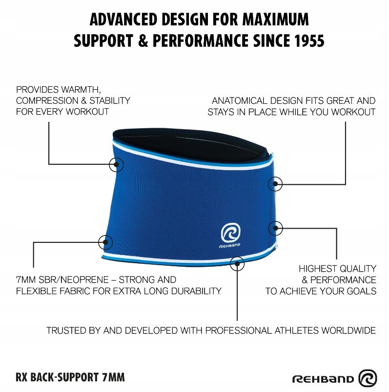 RX Original Back Support товщиною 7 мм - дуже стійкий неопреновий попереково-крижовий пояс. Підтримує правильну поставу та координацію рухів під час важких навантажень. У той же час пояс анатомічної форми розвантажує хребет і забезпечує тепло і стабілізацію. Це допомагає запобігти надмірному навантаженню м’яких тканин, яке може спричинити біль у нижній частині спини.