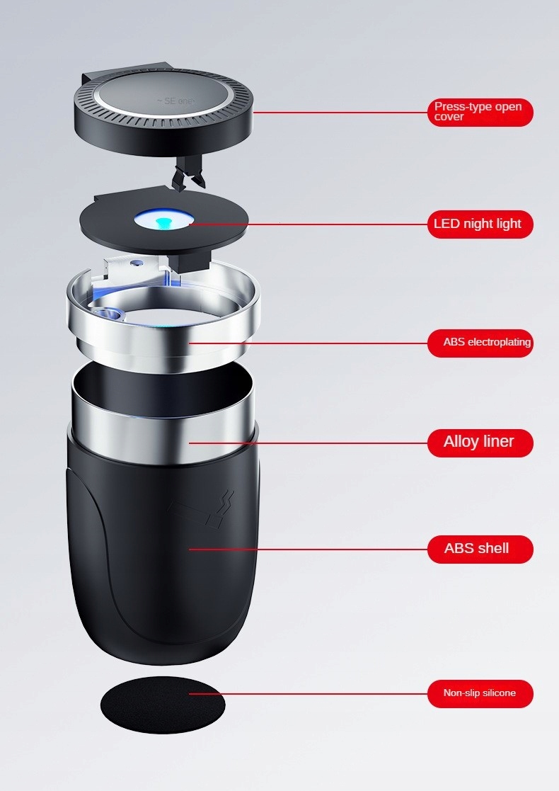 Виготовлений з високоякісного покриття ABS, Ashtray представляє не тільки естетично, але й міцний і простий у чистці. Його інтер'єр був зроблений з металевого сплаву, що гарантує довговічність та надійність. Крім того, під ними є не -ковзання, яка забезпечує стабільність і мінімізує рухи попільнички під час руху.