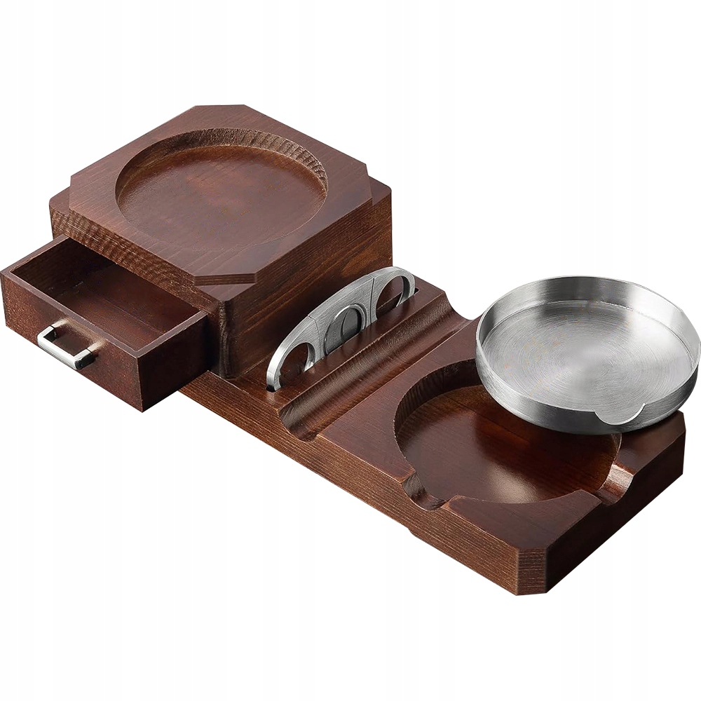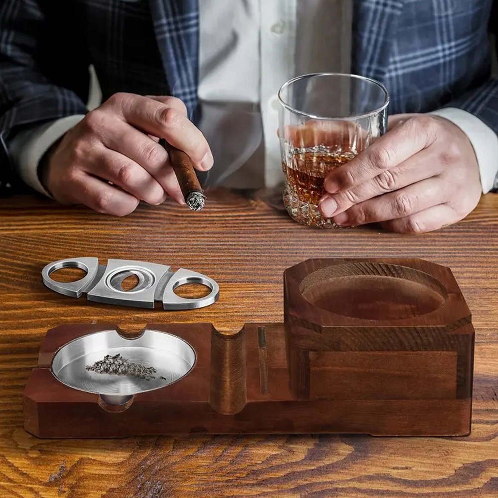 Ідеальне поєднання склянки для віскі та попільнички для сигар. У набір також входить високоякісний різак для сигар і чотири нековзкі накладки, які запобігають ковзанню попільнички. Піднятий ящик забезпечує зручний доступ. Крім того, він має гарно розроблену ручку для зручного розміщення, подібно до аксесуарів для сигар, таких як запальнички та пунші. Цей унікальний дизайн відповідає потребам усіх курців, забезпечуючи вищий рівень задоволення від куріння.