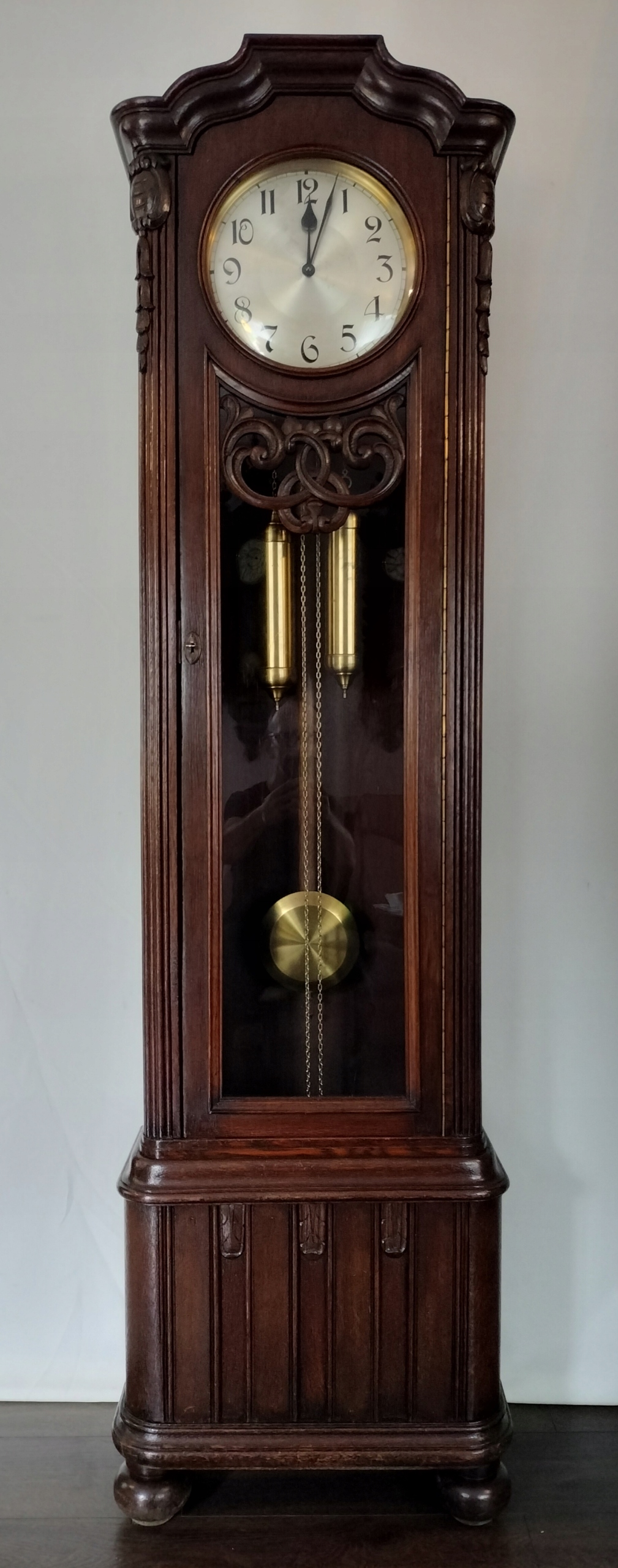 Дубовий корпус годинника в дуже цікавому та унікальному стилі. Верхнє вікно опукле, нижнє пряме, своєрідне, вкрите ажурною скульптурою. Все зачинено на робочий замок і ключ.