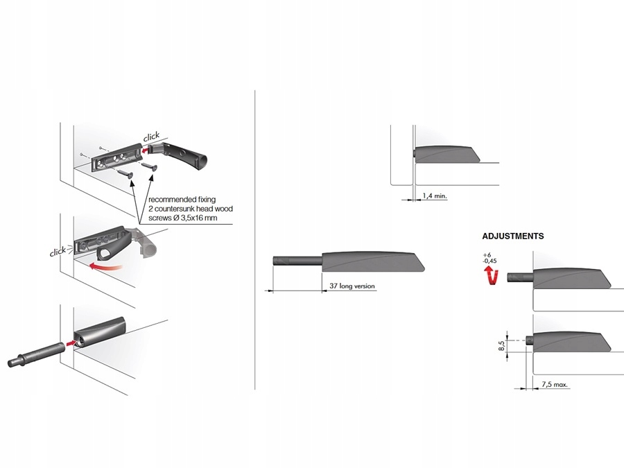 Механізм k-push-це механічна підтримка для відкриття дверей. Це допомагає відкрити двері / фронти без ручок. Натиснувши на свою поверхню - вони будуть відштовхуватися. Щоб закрити, просто натисніть їх трохи. Для оптимального ефекту бампер працює з петлями без весни, яку ми також пропонуємо на наших аукціонах. Бампер має регулювання, накручуючи або відкрутивши наконечник. Довга версія найчастіше використовується на дверях -близнюках. Це варіант з більшою потужністю, корисним для більших або більш важких дверей.