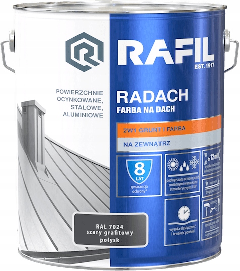 високоякісні наконечники прималії для фарби на даху 2 в 1: земля + фарба . Забезпечує підвищений захист від змінних погодних умов та випромінювання УФ. Він призначений для захисного живопису зовнішніх металевих поверхонь: сталь, оцинкована та алюміній . Фарба використовується як для нових картин , так і для оновлення старих фарб . Він характеризується відмінною адгезією до землі . Створює швидкі, дуже гнучкі покриття з підвищеною стійкістю до сонячного світла, води та інших погодних умов . Порадна фарба на даху забезпечує довгий ефект декоративні пофарбовані поверхні, а в поєднанні з антикорозійною основою Raffil -це сильний захист від корозії.