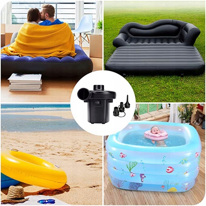 Електричний насос живиться від електричної розетки. Призначений для надування та видалення повітря з різних предметів, наприклад, м'ячів, матраців, надувних подушок, понтонів тощо. Завдяки компактній конструкції не займає багато місця.