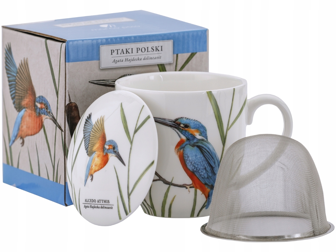 - Oryginalny, porcelanowy kubek z zaparzaczem, ozdobiony ilustracjami dwóch ZIMORODKÓW na białym tle (z jednej strony jest sylwetka ptaka siedzącego, z drugiej Lecącego)