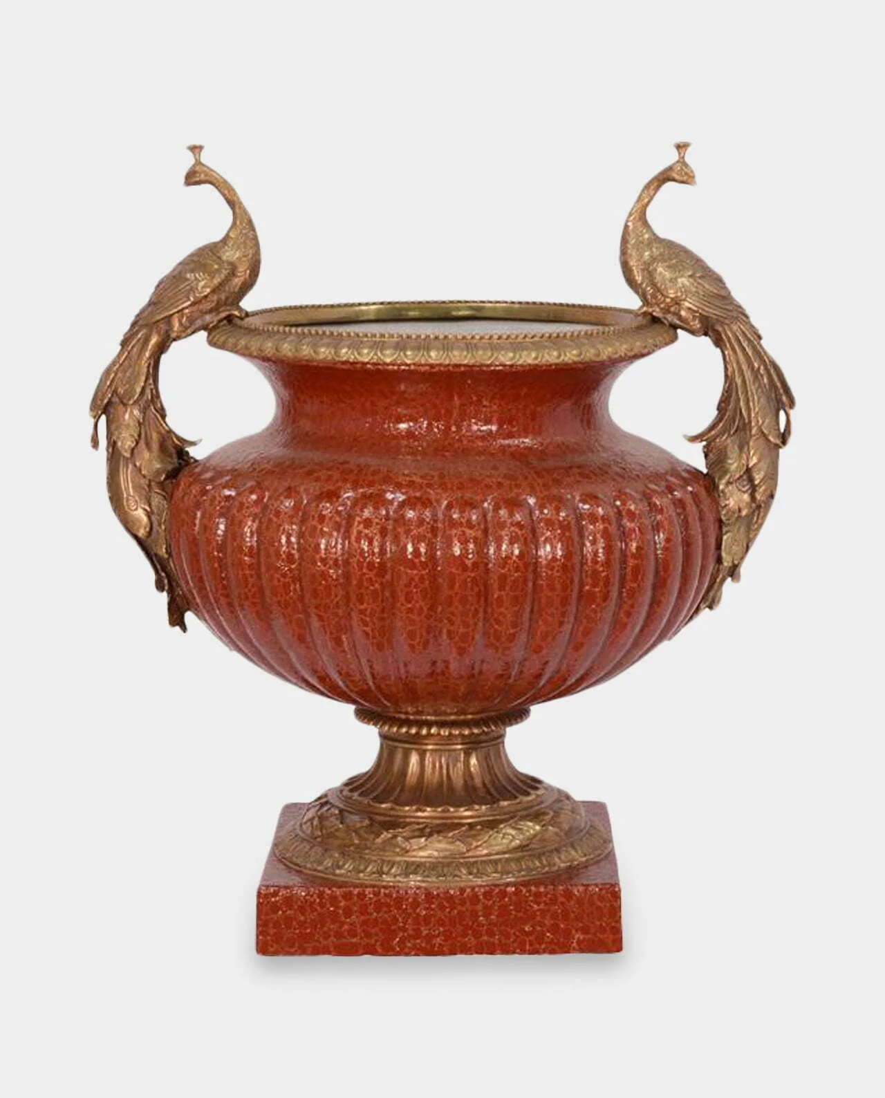 Унікальна порцелянова амфора на основі, з бронзовою фурнітурою. Красиво, багато прикрашений бронзовими скульптурами із зображенням двох павичів, що сидять на краю посудини, які також утворюють ручки. Виготовлений з ексклюзивних матеріалів, дуже акуратно, з увагою до найдрібніших деталей. Він справляє чудове естетичне враження та має позачасовий стиль. Підходить для багатьох інтер'єрів.