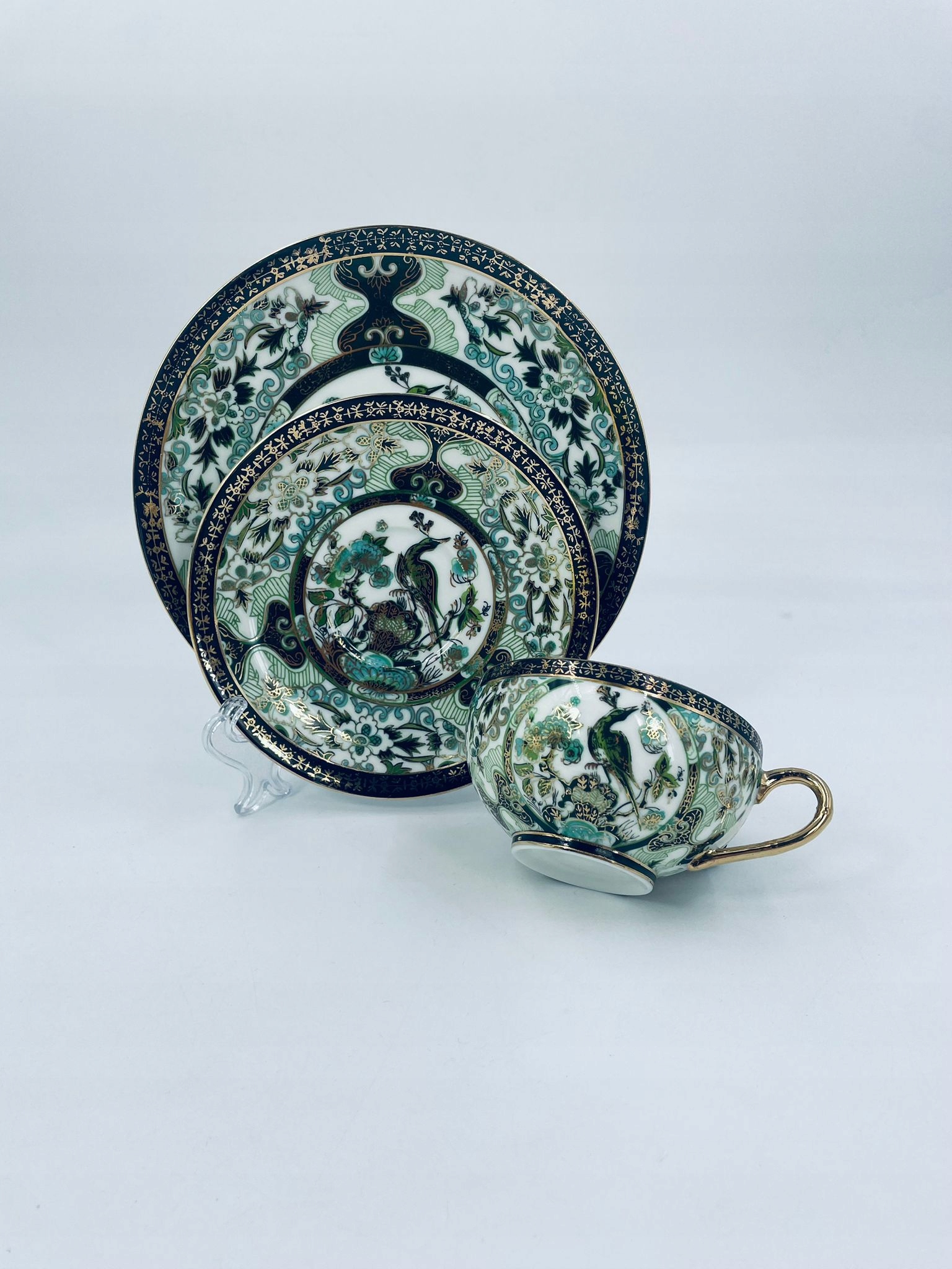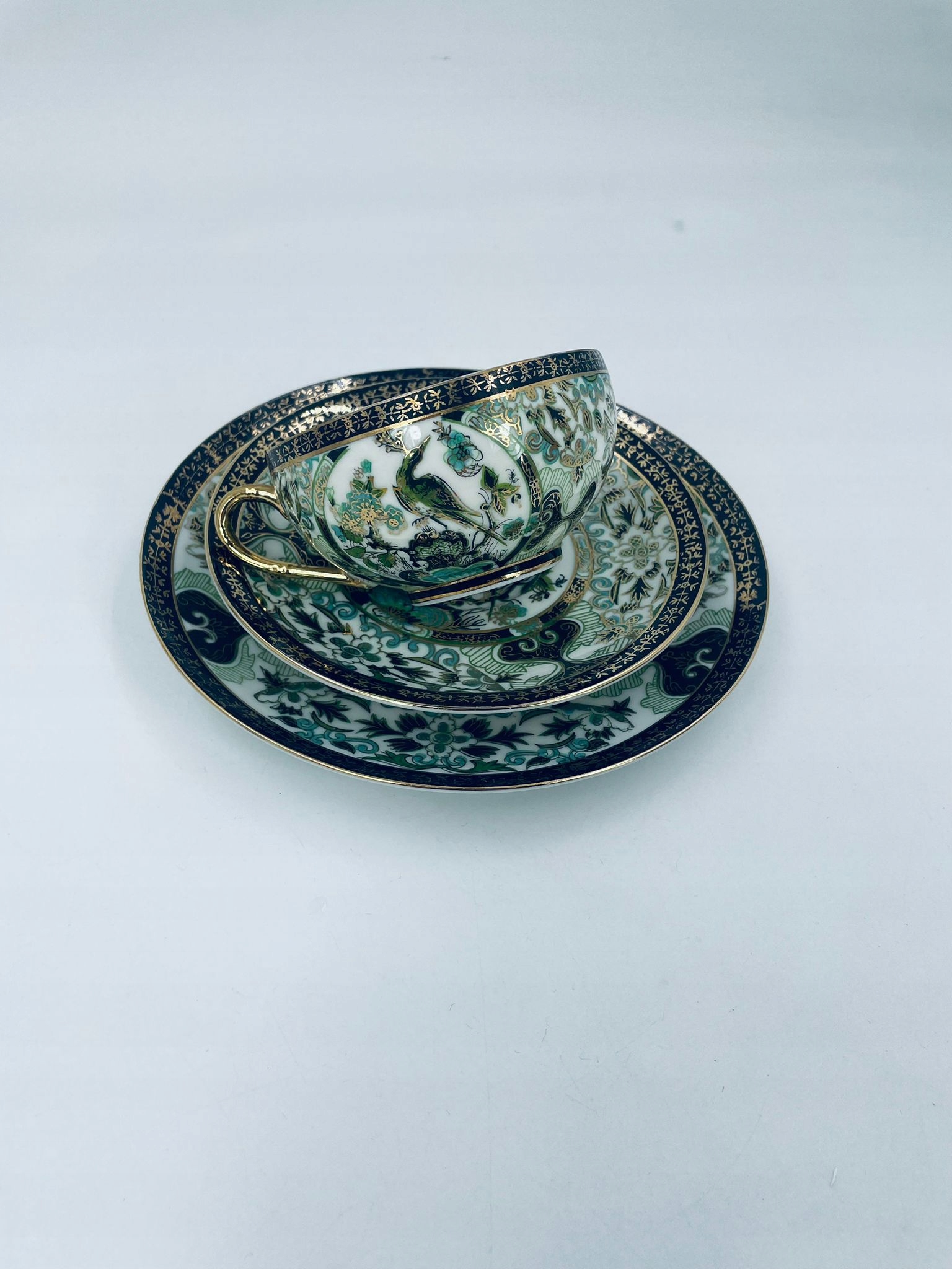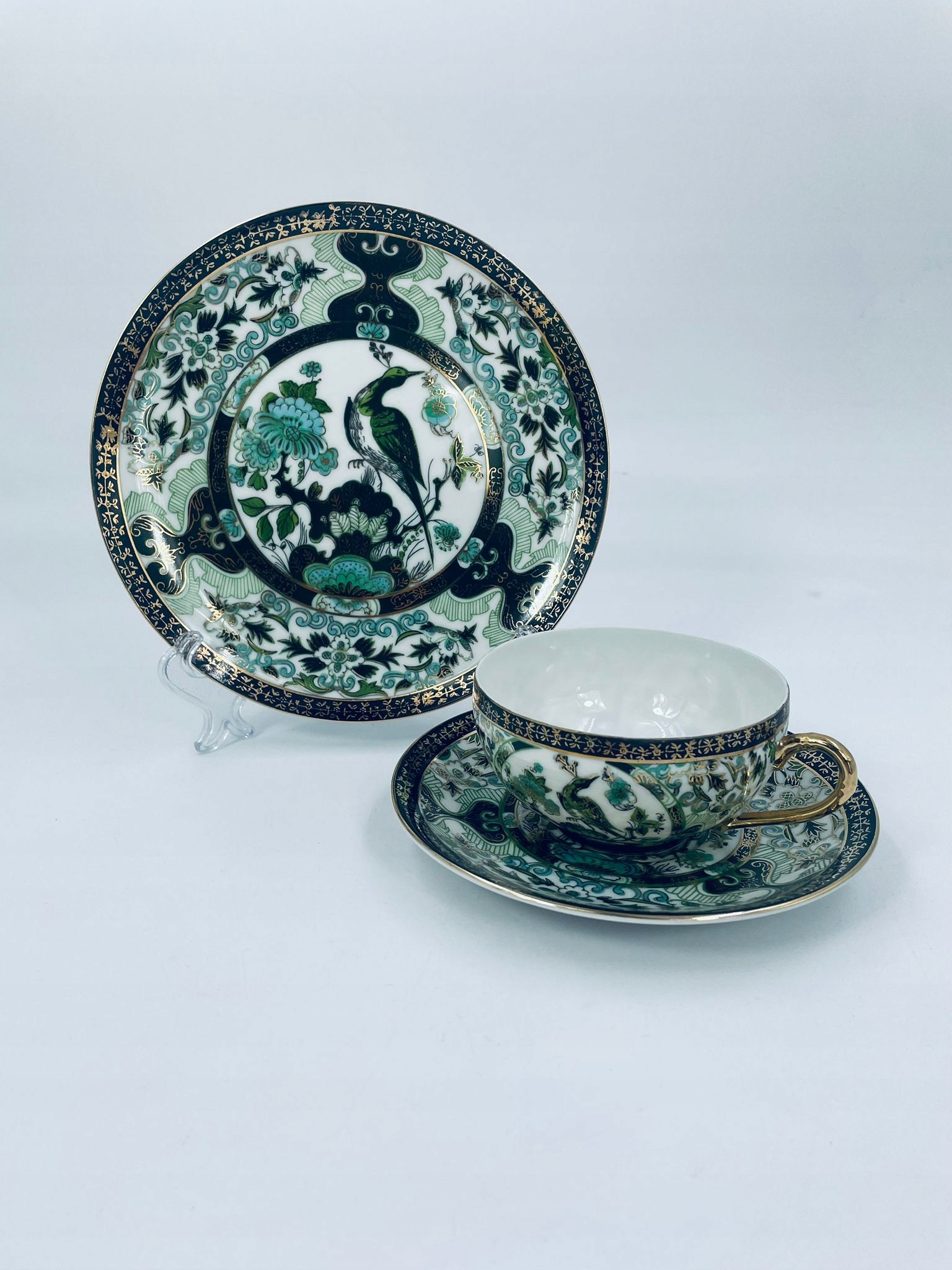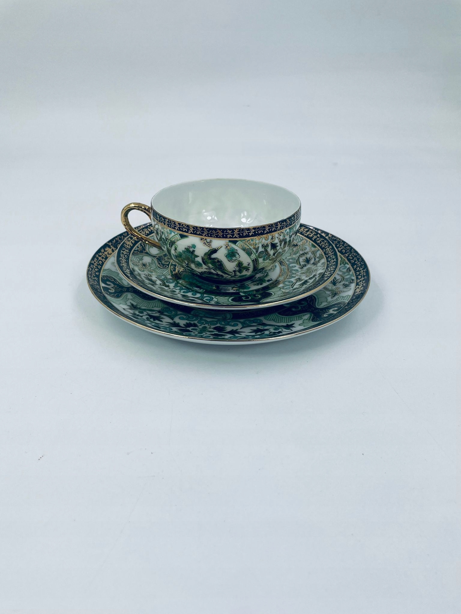 Кубок колекціонера, включений до набору тріо в Китаї Саджі Японії. Прекрасний зелений набір із золотою реле. Мотив на знімальному майданчику - це круглий медальйон з раєм птахом, оточений квітковим прикрасою та декоративними мотивами. Чашка, виготовлена з дуже тонкого порцеляни. Всередині чашки жіноче обличчя тисне.