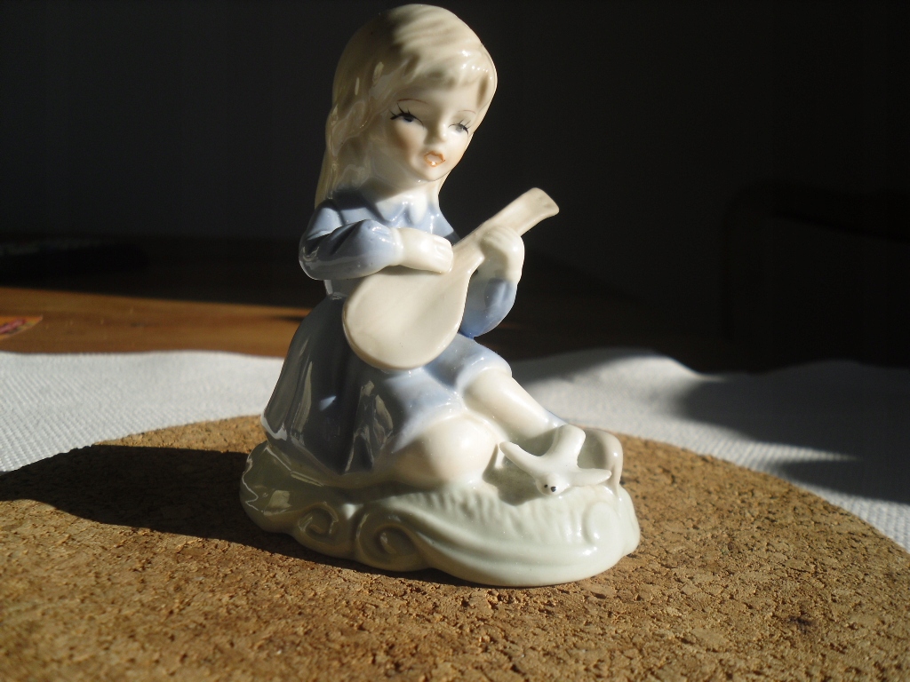 Порцелянова фігурка дівчини, що грає мандоліну з пташиною керамікою