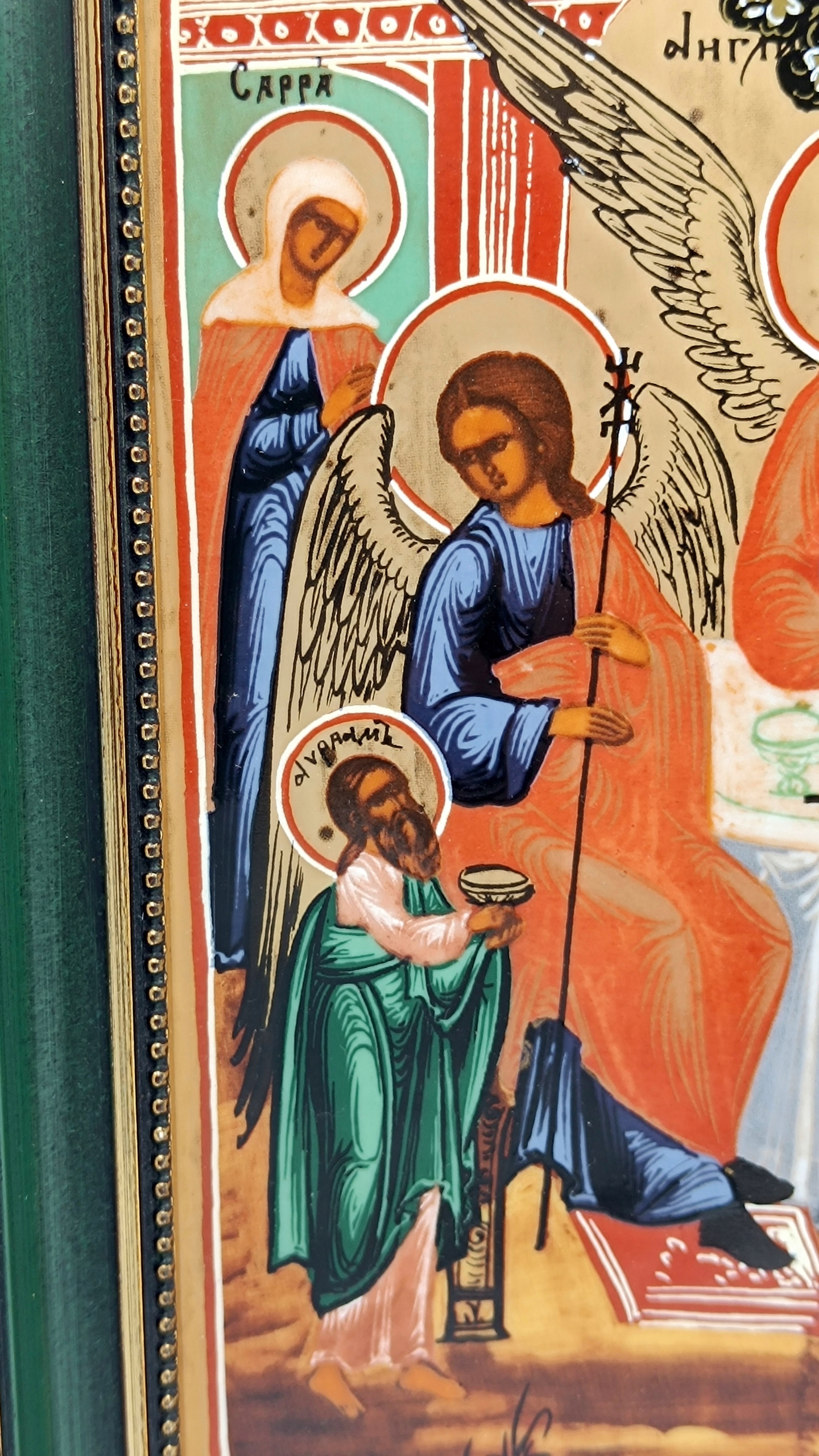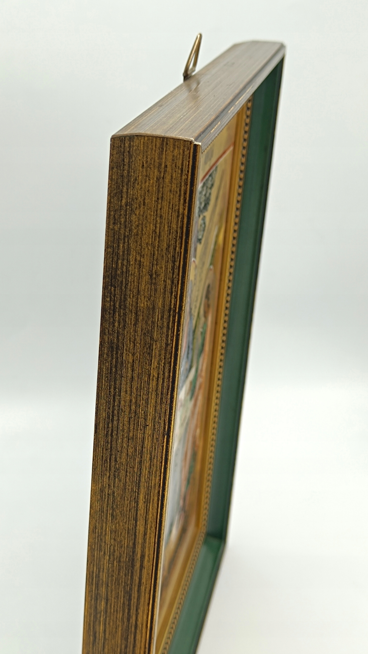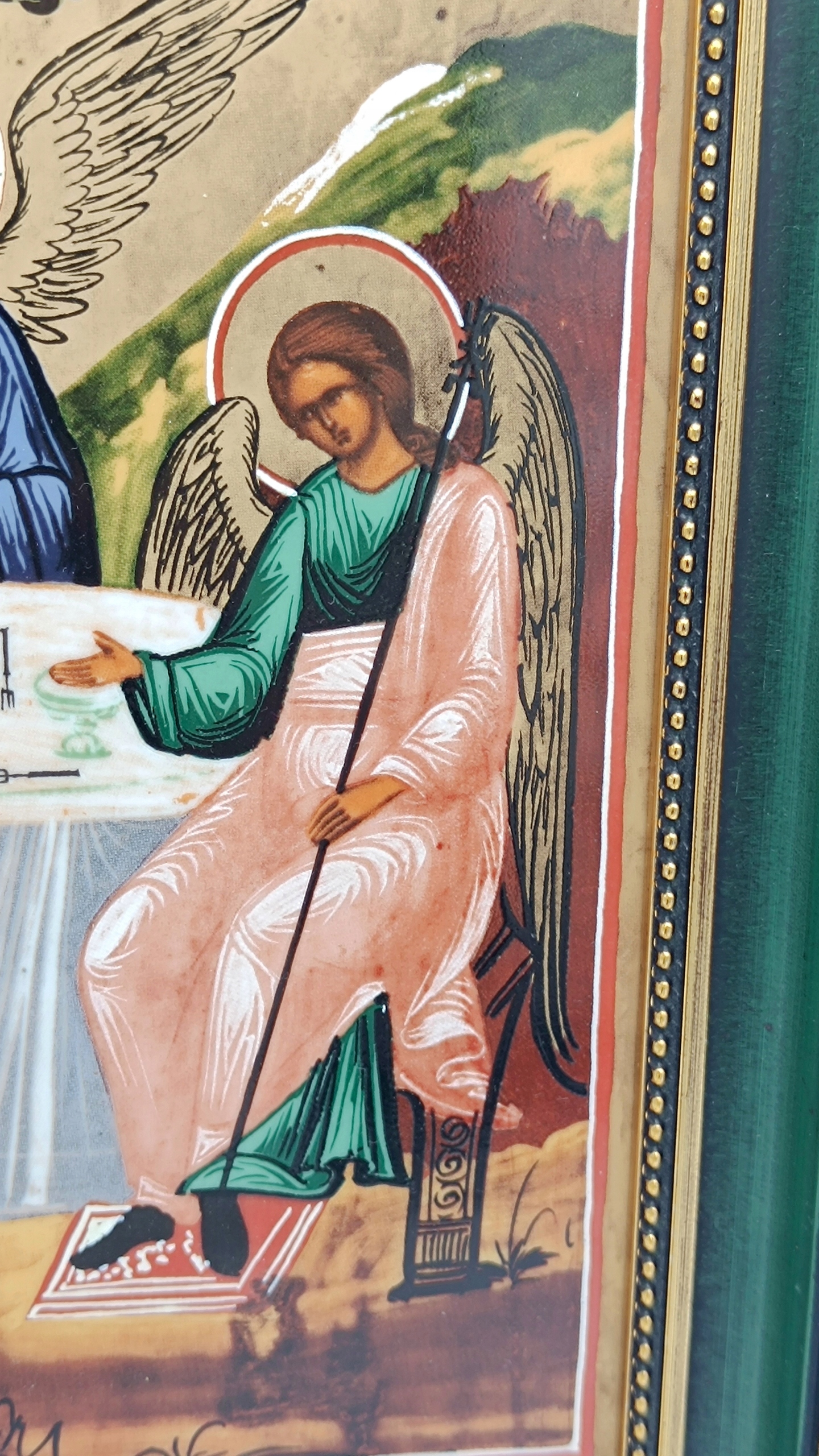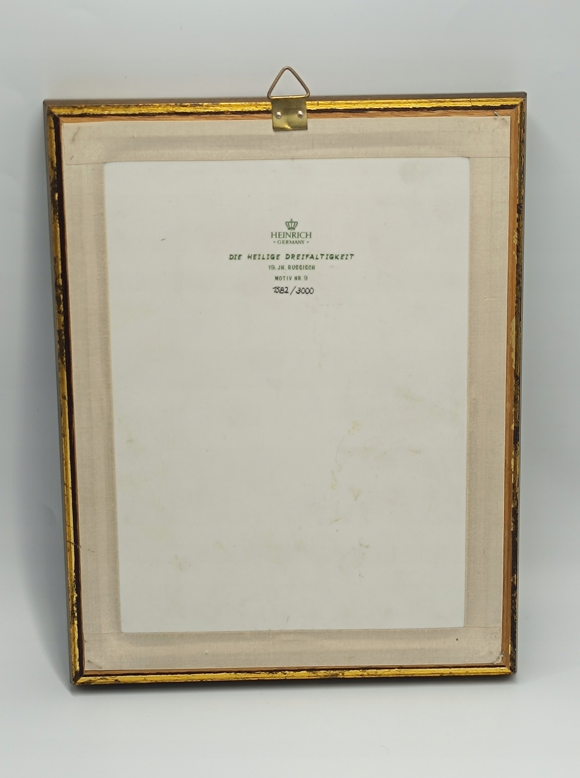Зображення, зроблене за допомогою порцелянового екрана, надрукованого на дерев’яну раму. У ньому є кулон на спині, щоб повісити на стіну. Зображення, що зображує Святу Трійцю, має досить інтенсивні кольори завдяки тому, що він виглядає чудово. Пляшка зелена, дерево та позолоти гармонізують один з одним. Підпис знаходиться внизу.