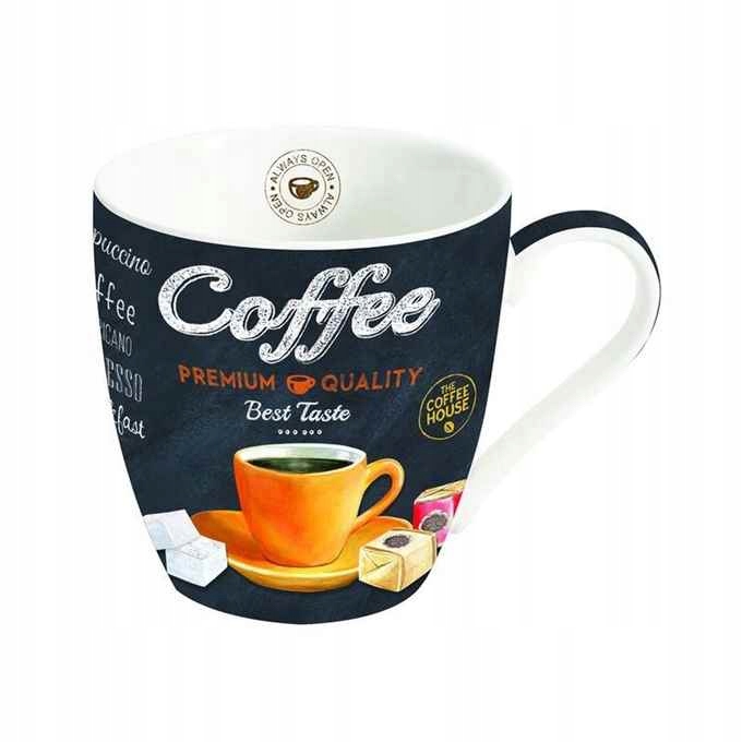 Соцільна, ефектна, дуже «кавова» кухоль прикрашена мотивом помаранчевої чашки з чорною кавою, шоколадними праліне, кубиками цукру та кавовими написами, на неоднорідній, чорній , матовий фон, що є специфічним високоякісним друком.