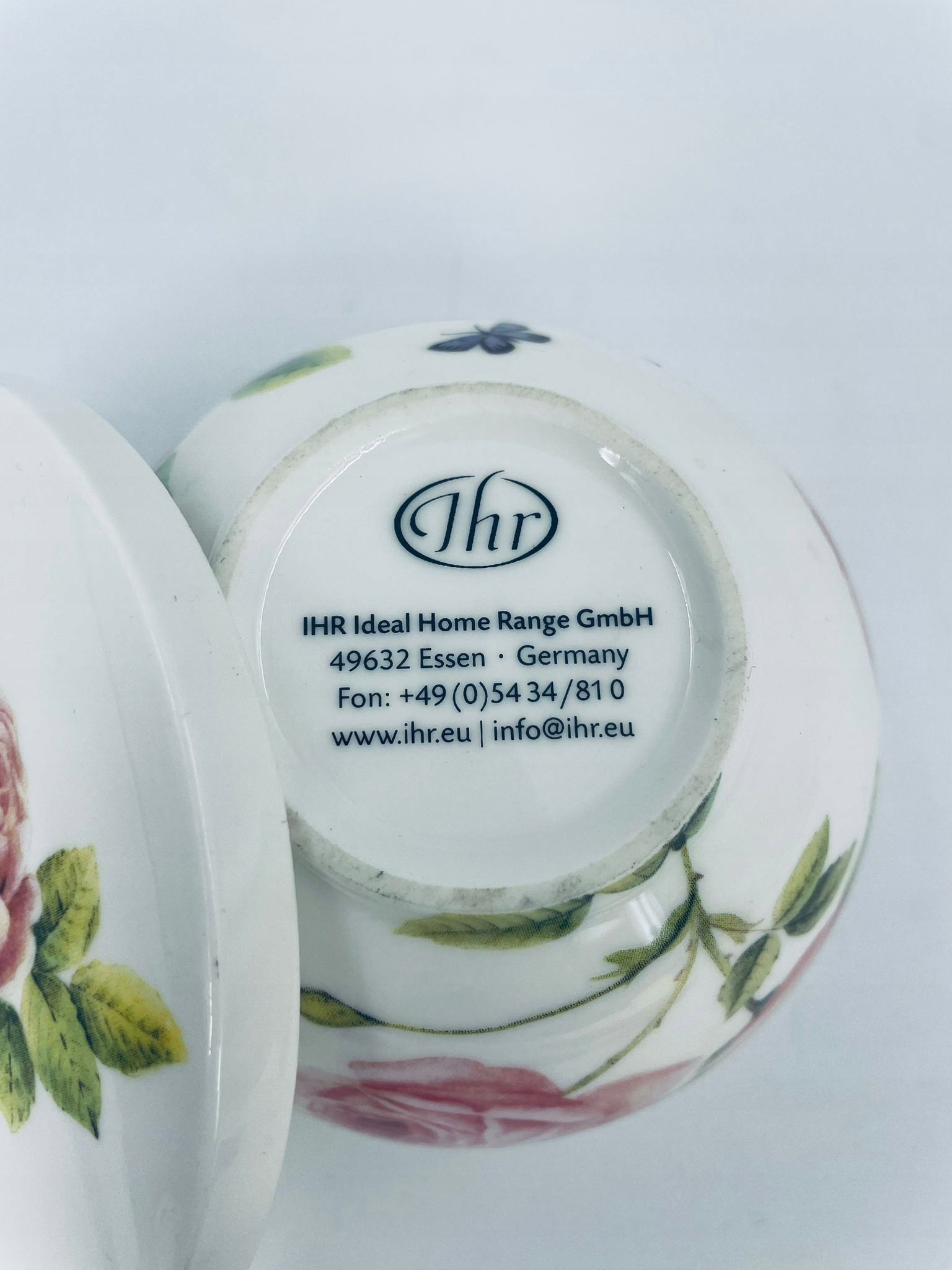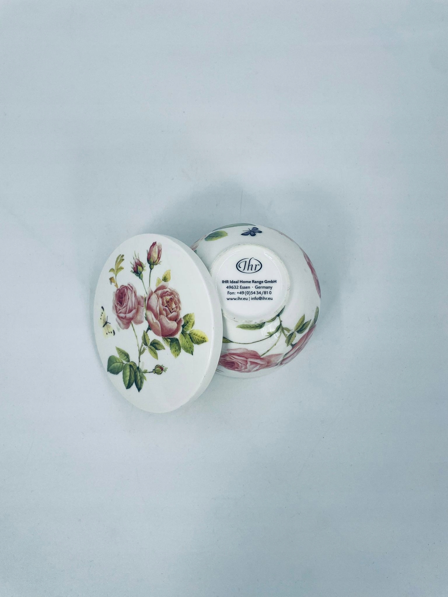 Шкатулка від німецького виробника IHR Ideal Home Range GmbH з Ессена, виготовлена з високоякісної білої порцеляни. Контейнер з кришкою характеризується візерунком красивих рожевих троянд з листям і метеликом. Можна використовувати як коробку, контейнер для дрібничок, цукорницю.