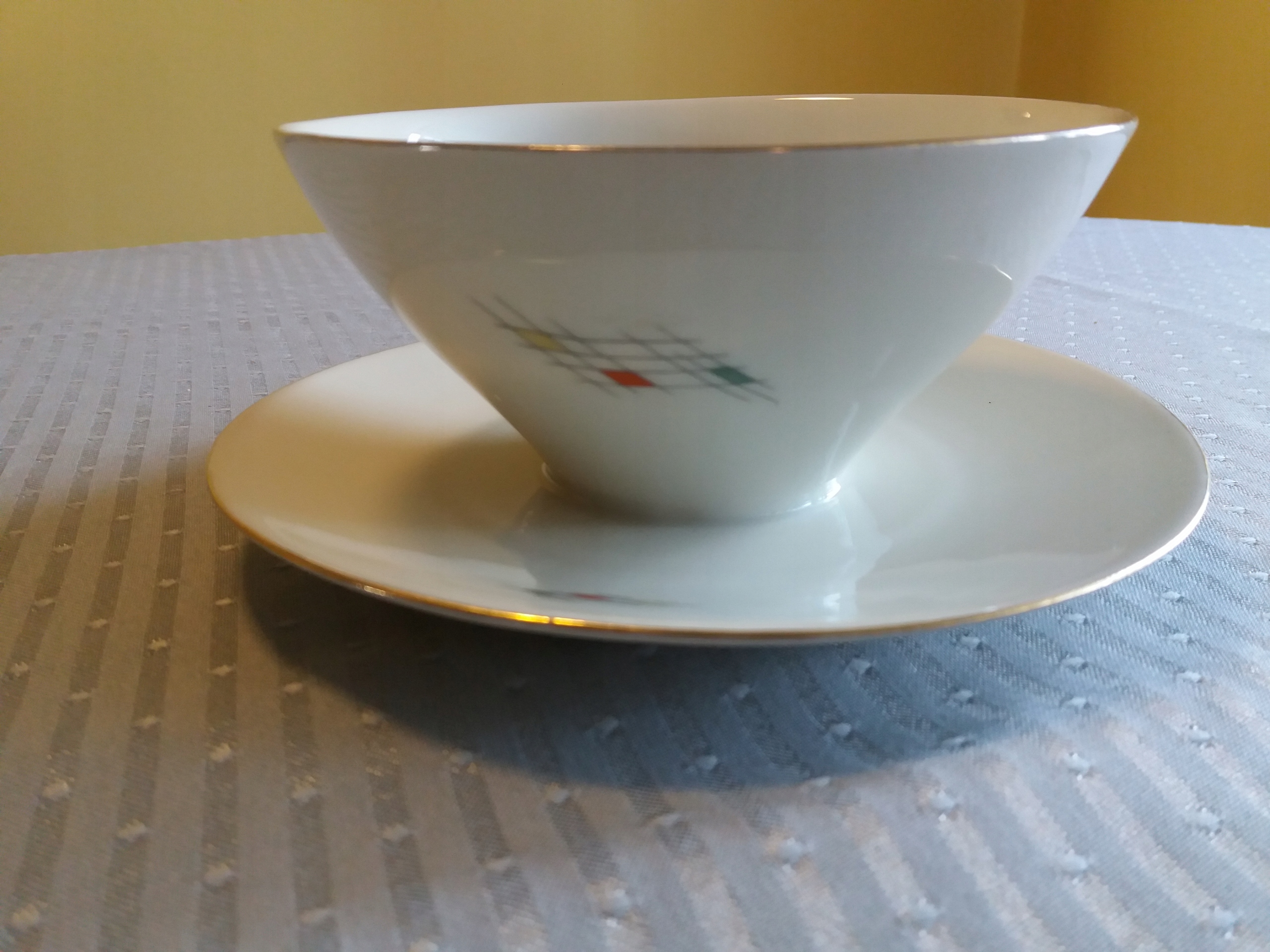 РОЗМІРИ ПОРЦЕЛЯНОВОГО БЛЮДА ДЛЯ СОУСУ: ВИСОТА 7,5 СМ, ДІАМЕТР ДНОВИ 17,7 СМ. ТРЕЩО ПОШКОДЖЕНА