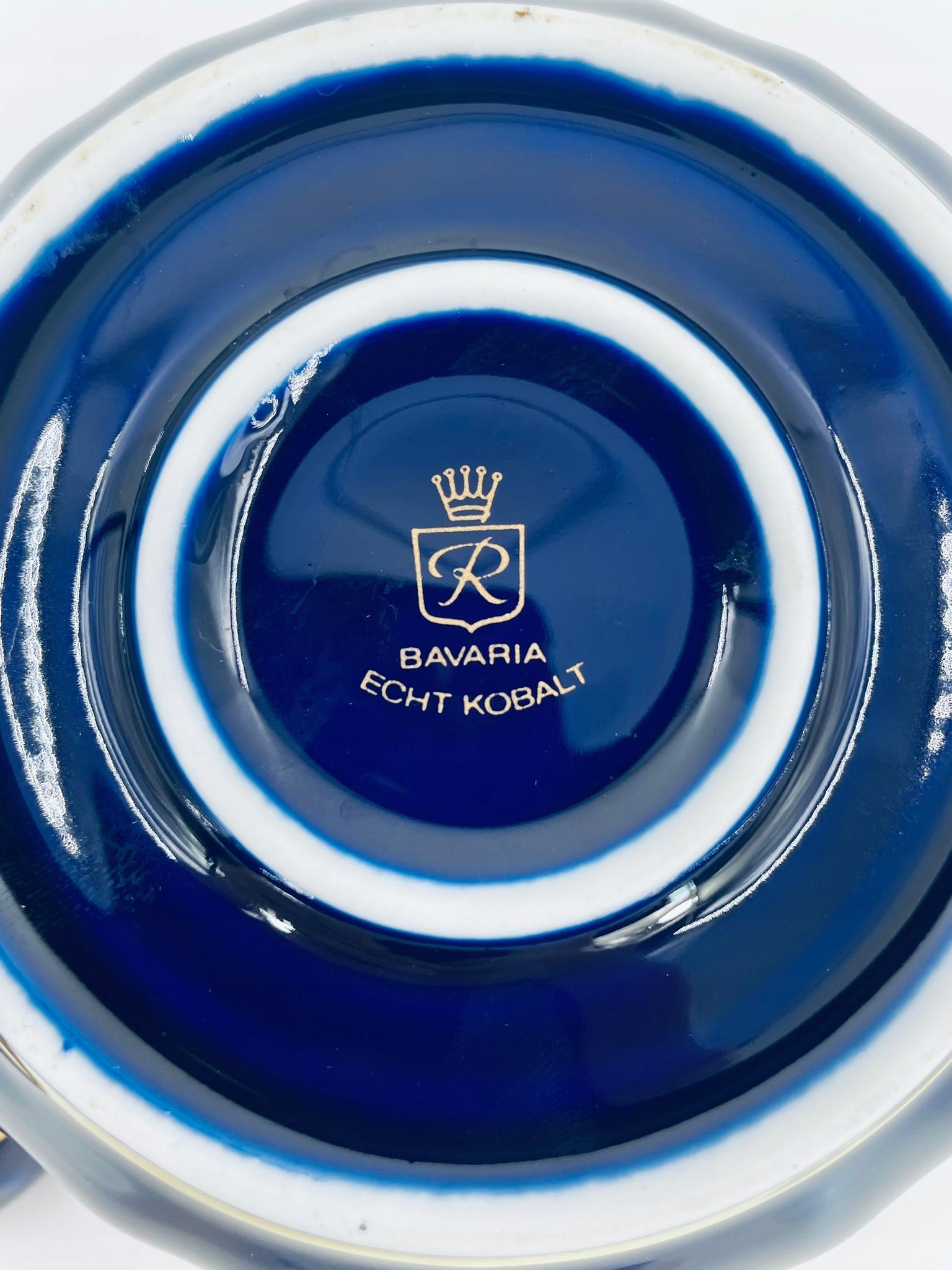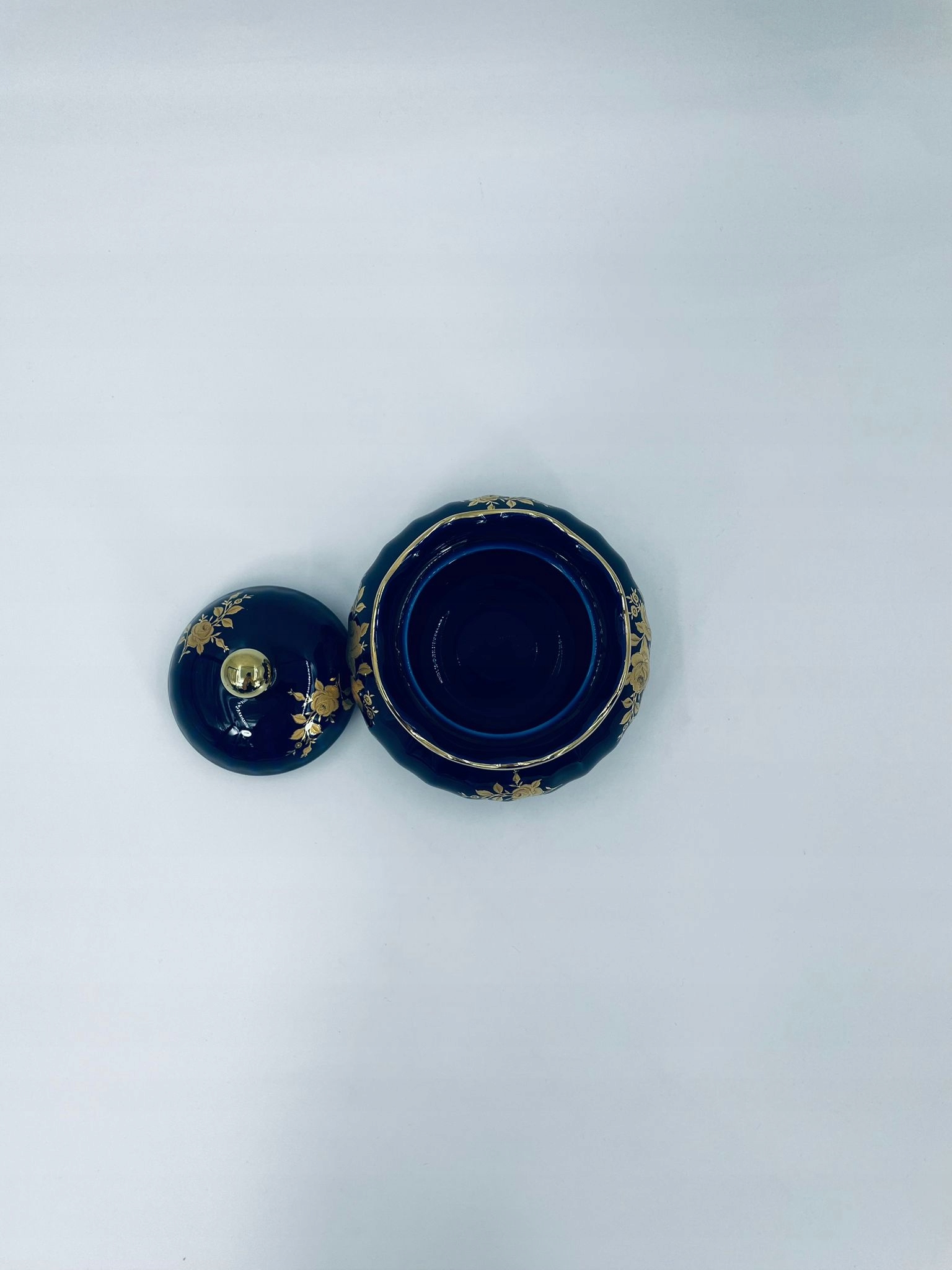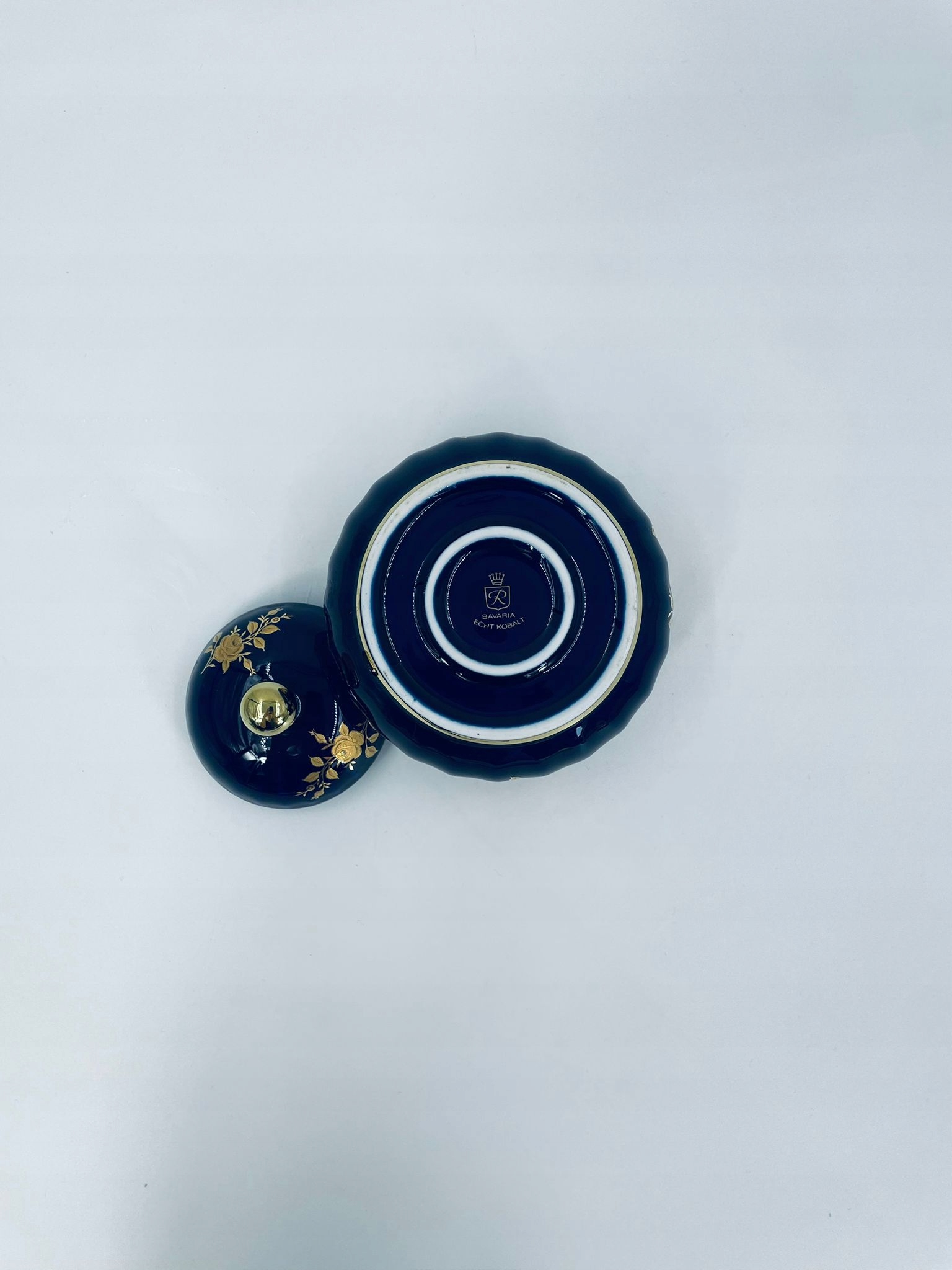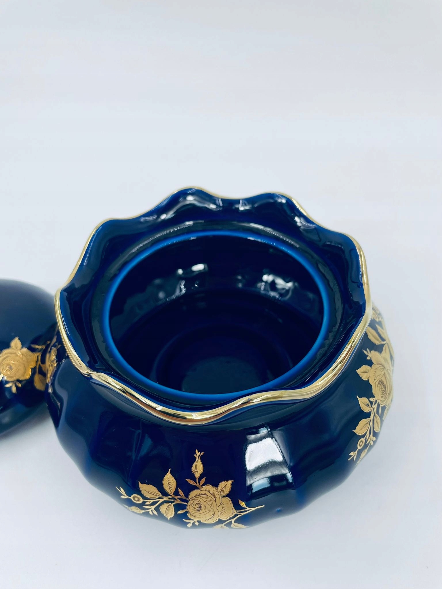 wunsiedel echt kobalt bavaria sugar Bowl, виготовлена з високоякісного порцелянового кольору кобальту. Цукрова чаша має декоративну, хвилястий верхній край, закруглену форму тіла та 24-каратні золотисті троянди. 10см.