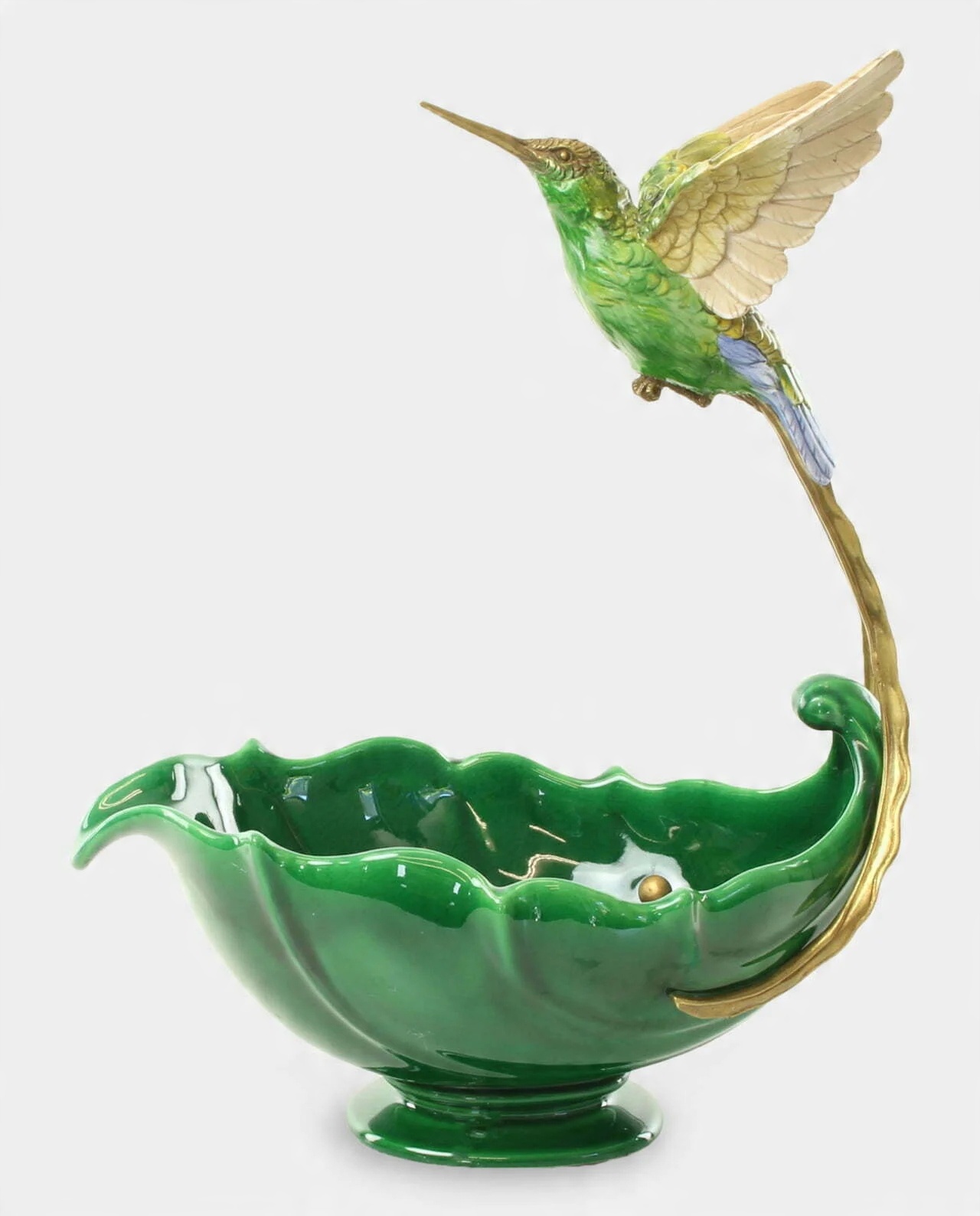 Красива чаша з колібрі з порцеляни з елементами бронзи. Зелений лист, зігнутий у формі чаші, на хвості якого сидить колібрі. Виготовлений з ексклюзивних матеріалів, дуже акуратно, з увагою до найдрібніших деталей. Він справляє чудове естетичне враження та має позачасовий стиль. Підходить до багатьох інтер'єрів.