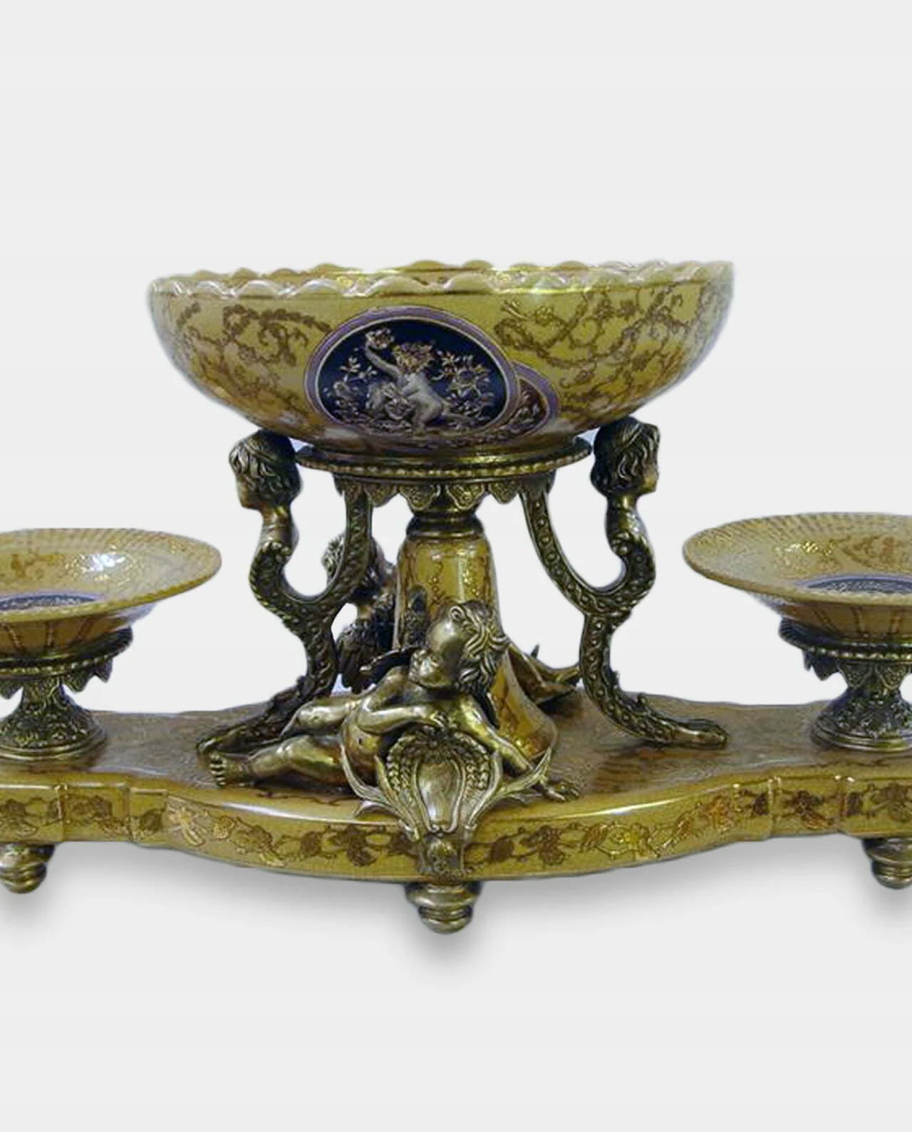Унікальне, порцелянове декоративне судно на основі бронзової арматури. Красиво, багатий оформлений і зафарбований у руку. Він містить три елементи в одній - центральну миску та дві невеликі тарілки з обох боків. У центральній частині бронзової скульптури із зображенням лежаючих ангелів. Виготовлений з ексклюзивних матеріалів, дуже точно, з увагою до найменших деталей. Це справляє величезне естетичне враження і має позачасовий стиль. Підходить для багатьох інтер'єрів.
