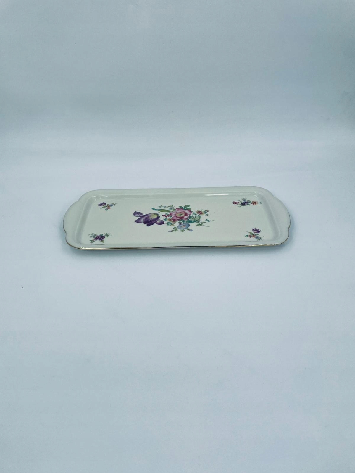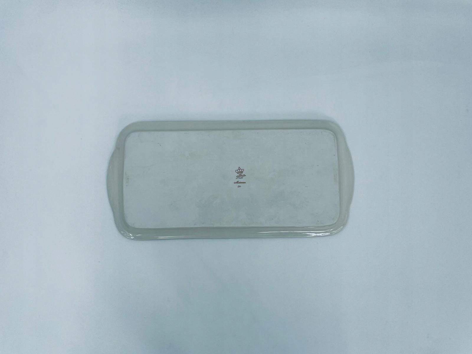 Декоративна тарілка Alka Bavaria Meissen, виготовлена з високоякісної порцеляни кольору екрю. Тарілка довгастої форми з розписаним вручну квітковим мотивом, оздоблена золотою позолотою по краю. Має потертості на позолоті.