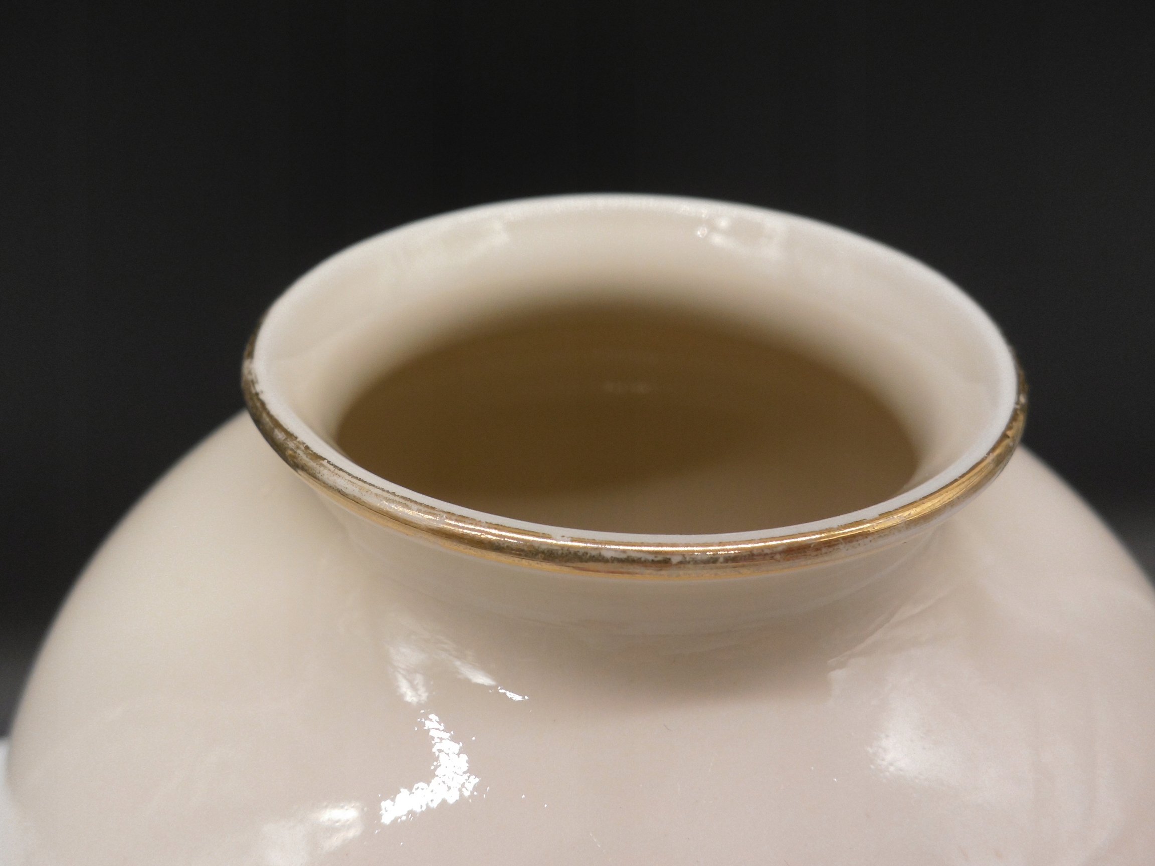 - Ваза світло-екрю, має золоті обідки по верхньому краю та підставі.