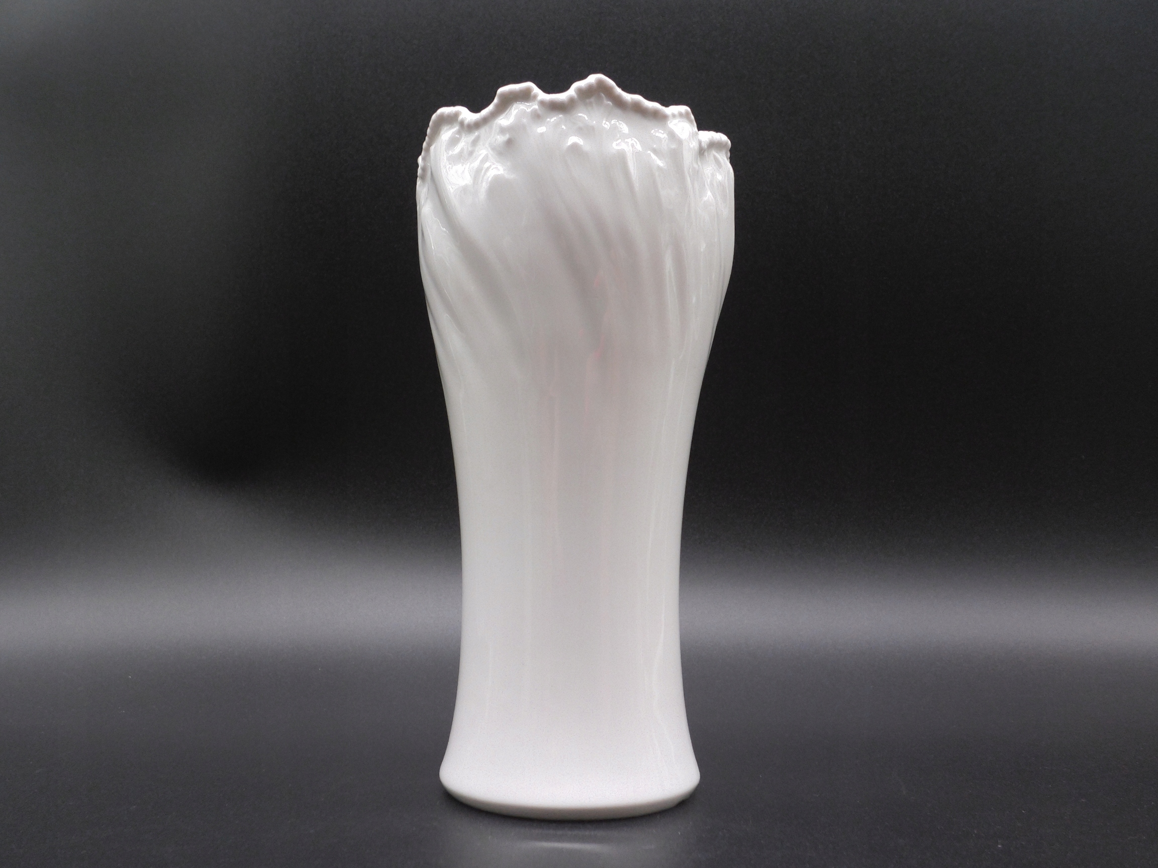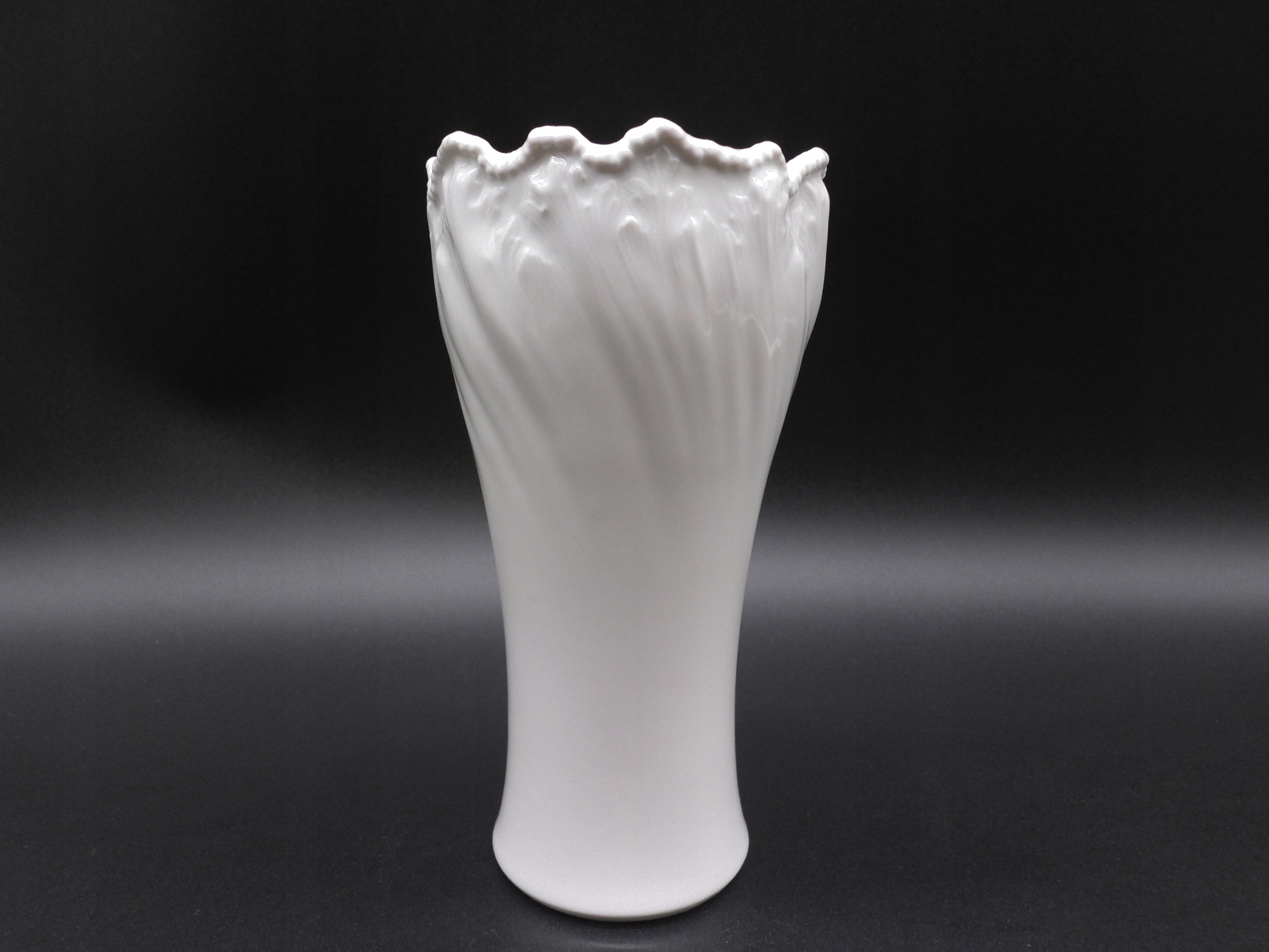 біла порцелянова ваза з хвилястим обідком і рельєфним візерунком
