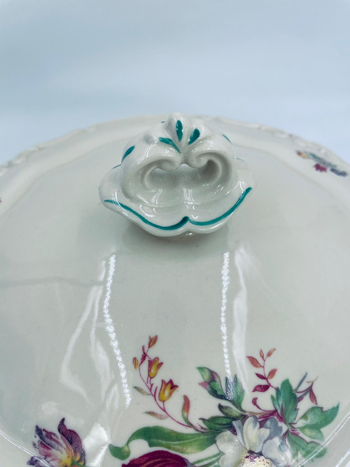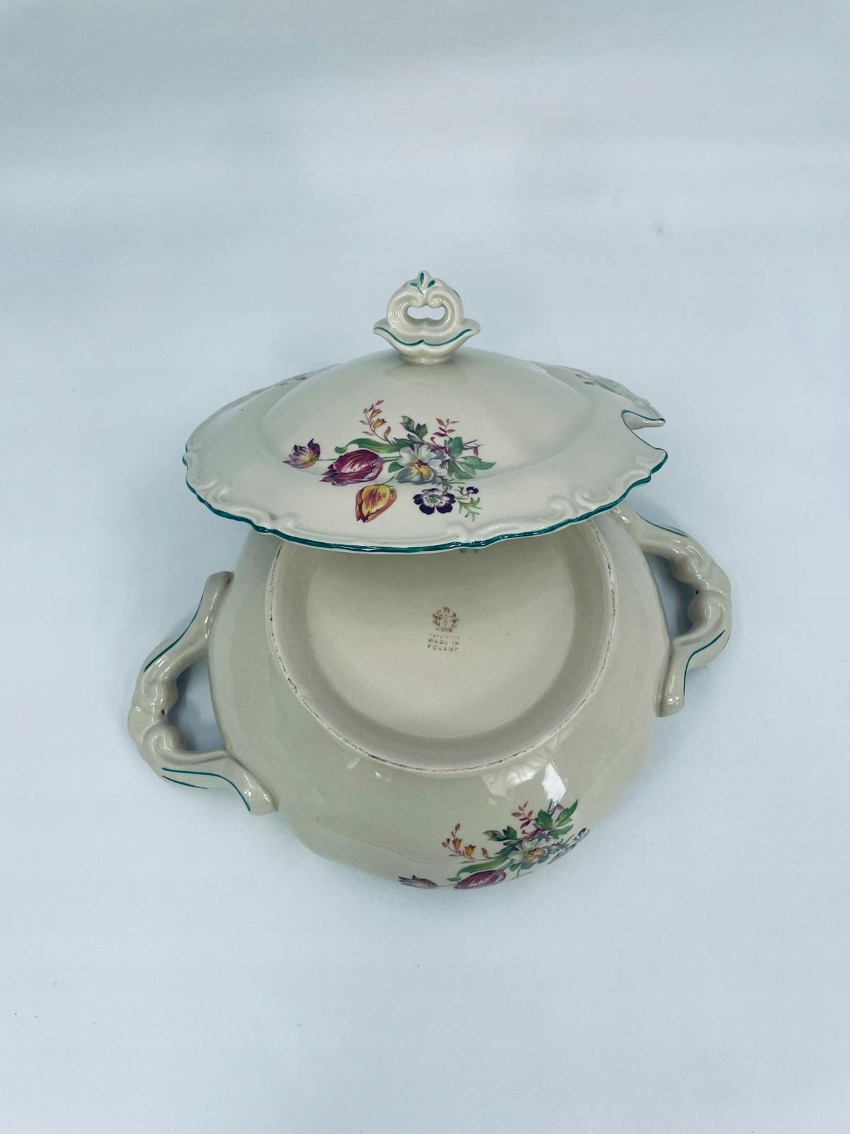 Ваза з ручками виробництва Tułowice Polska, виготовлена з високоякісної порцеляни кольору екрю. Ваза прикрашена мотивом із різнокольорових квіткових композицій із зеленою облямівкою на хвилястому краї та на ручках.
