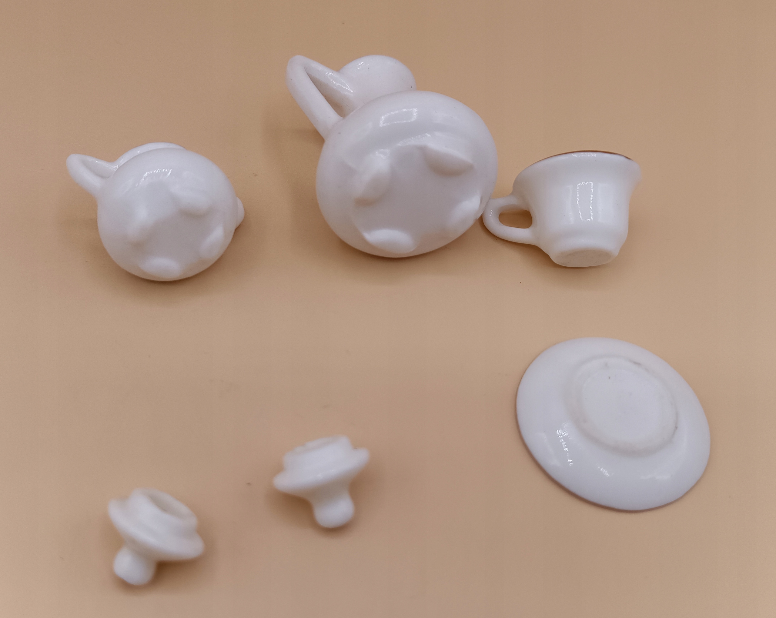 Розміри окремих мініатюр: глечик 4см, чашка 1,5см, тарілка 3см, цукорниця 2см,