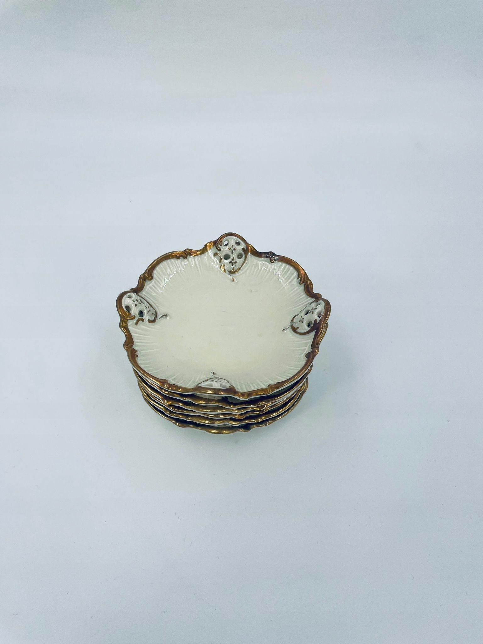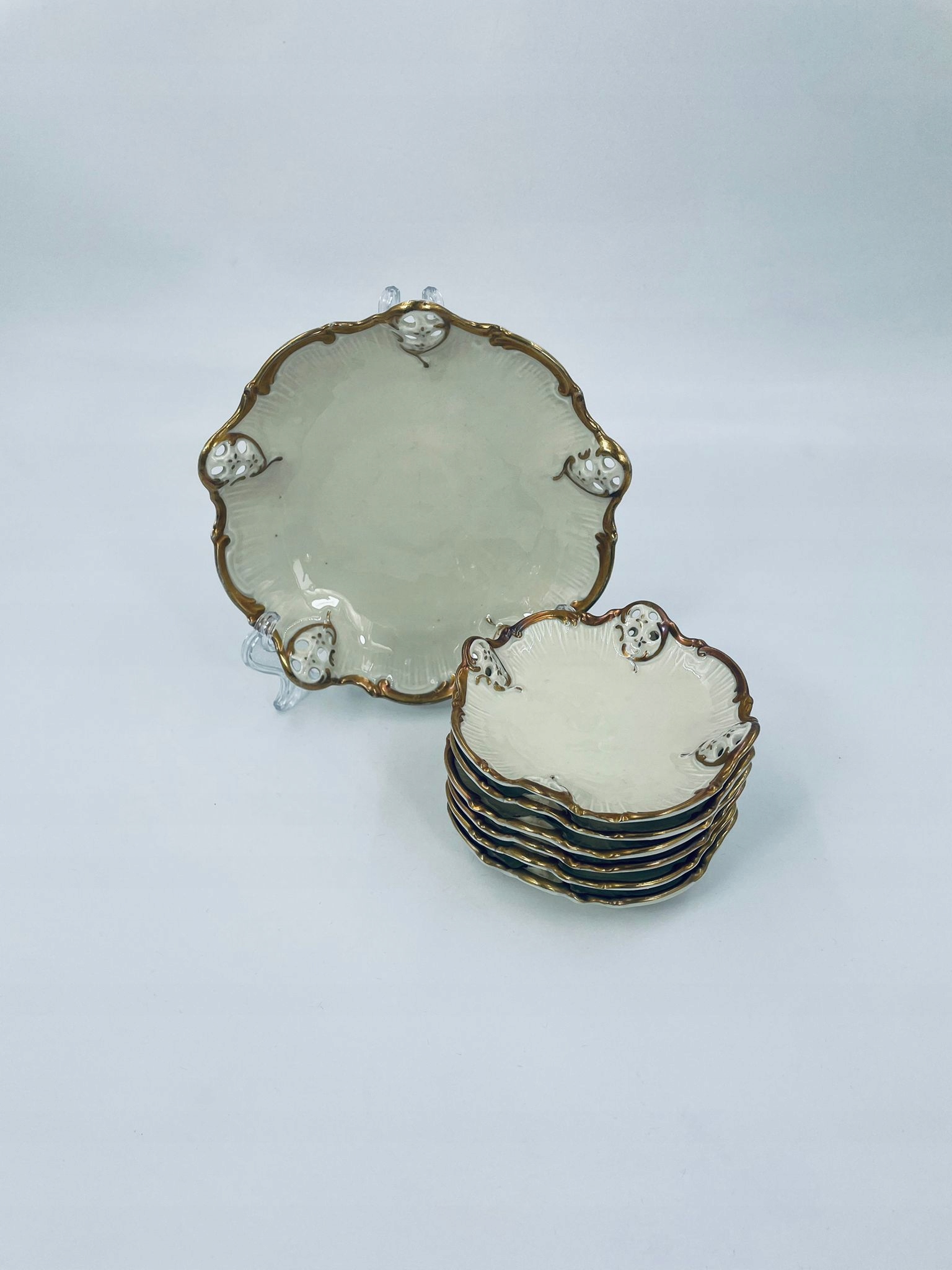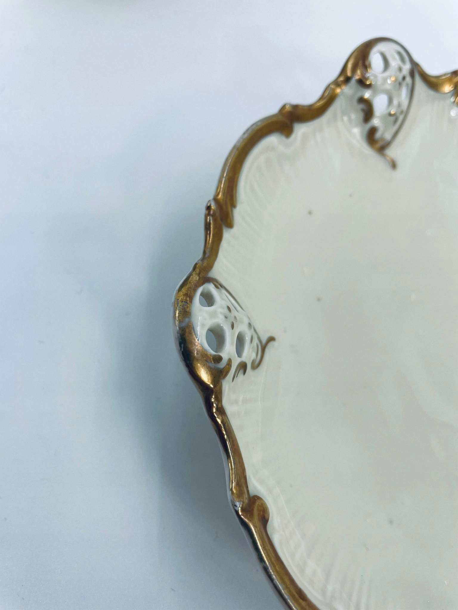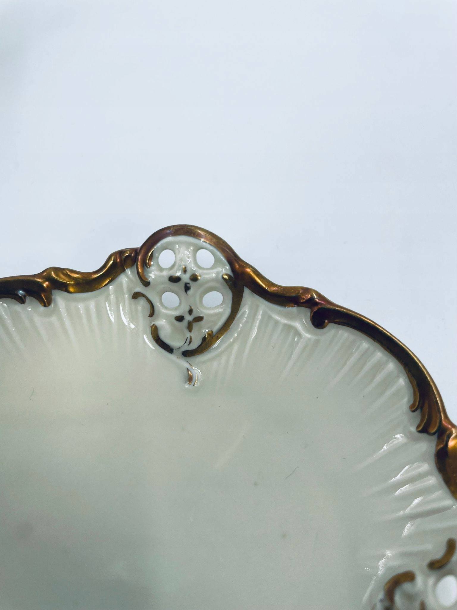 Декоративні тарілки Rosenthal Moliere виготовлені з високоякісної порцеляни кольору екрю. Для них характерний елегантний крій Мольєра, часто натхненний стилем рококо. Тарілки прикрашені рельєфним мотивом і ажурними вставками, наприклад сітками. Набір оброблений золотом по краях і контурам прикрас. Ці тарілки є елегантними декоративними та колекційними елементами. Тарілка має невеликі потертості на позолоті.