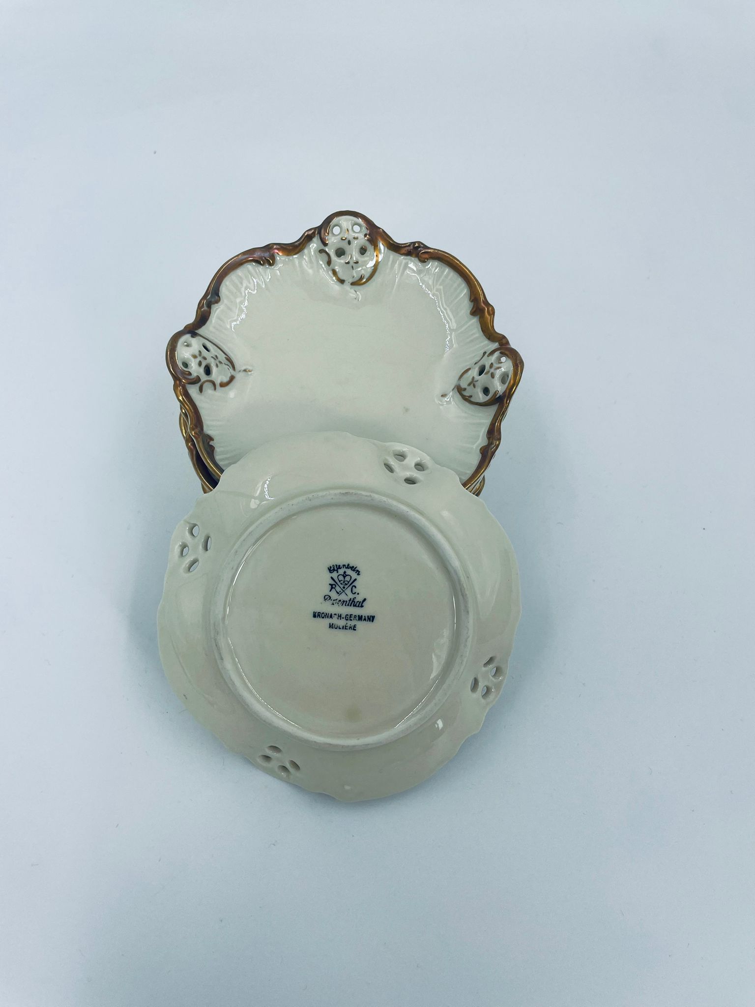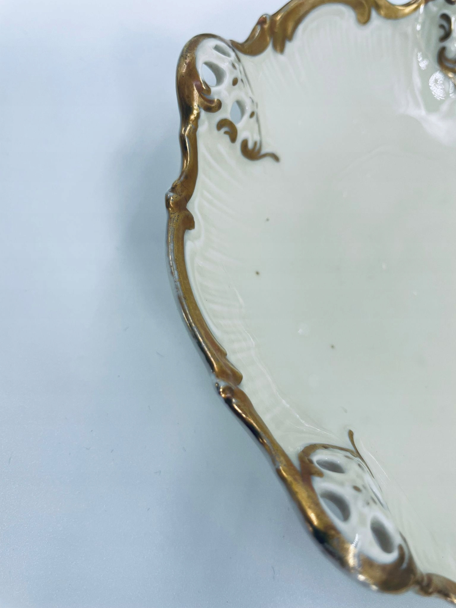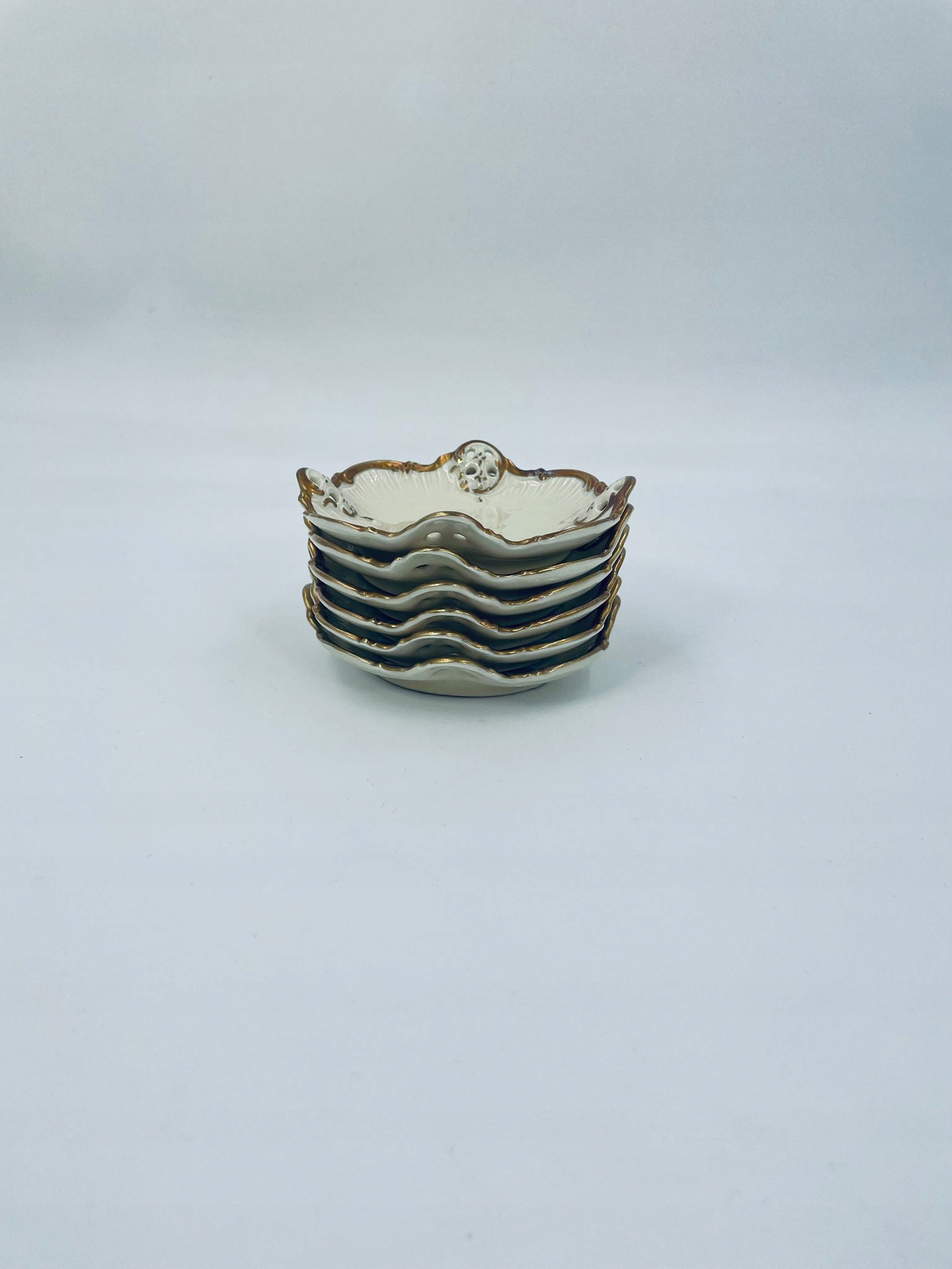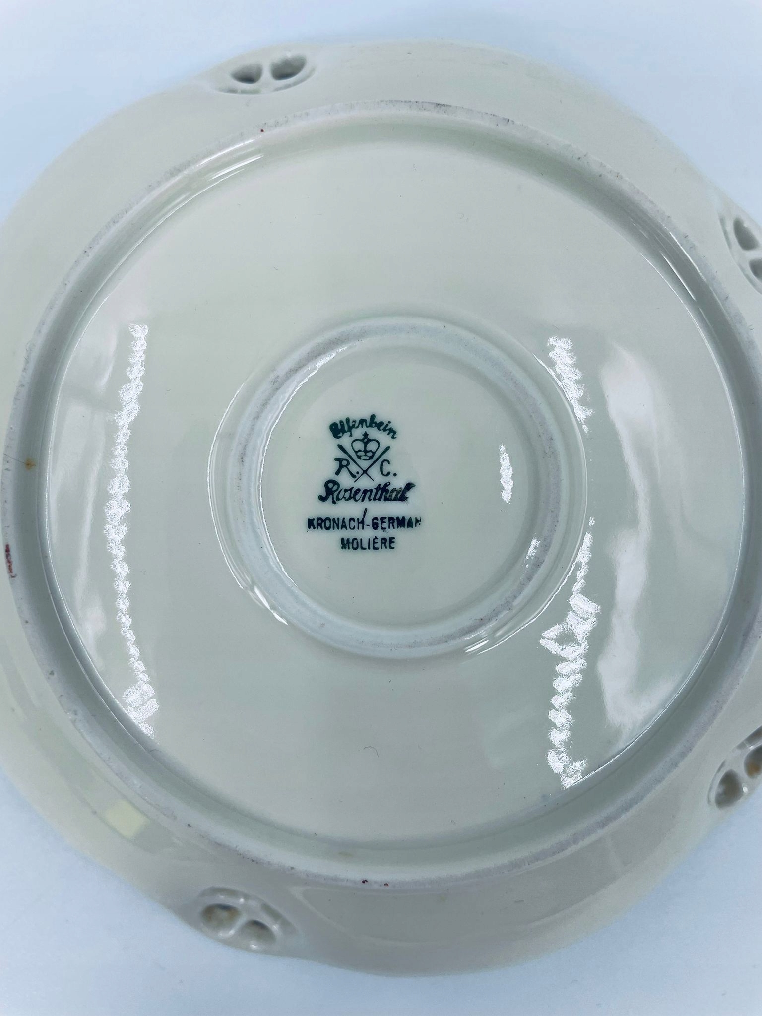 Декоративні тарілки Rosenthal Moliere виготовлені з високоякісної порцеляни кольору екрю. Для них характерний елегантний крій Мольєра, часто натхненний стилем рококо. Тарілки прикрашені рельєфним мотивом і ажурними вставками, наприклад сітками. Набір оброблений золотом по краях і контурам прикрас. Ці тарілки є елегантними декоративними та колекційними елементами. Тарілка має невеликі потертості на позолоті.