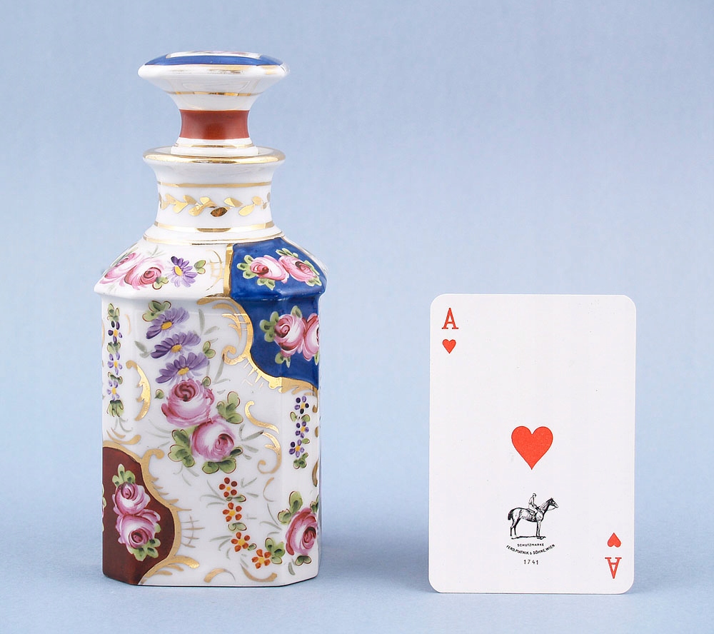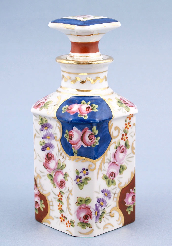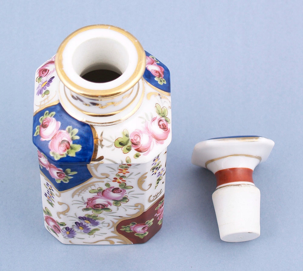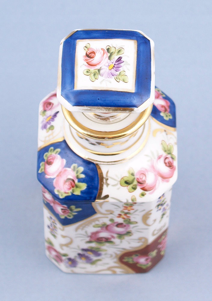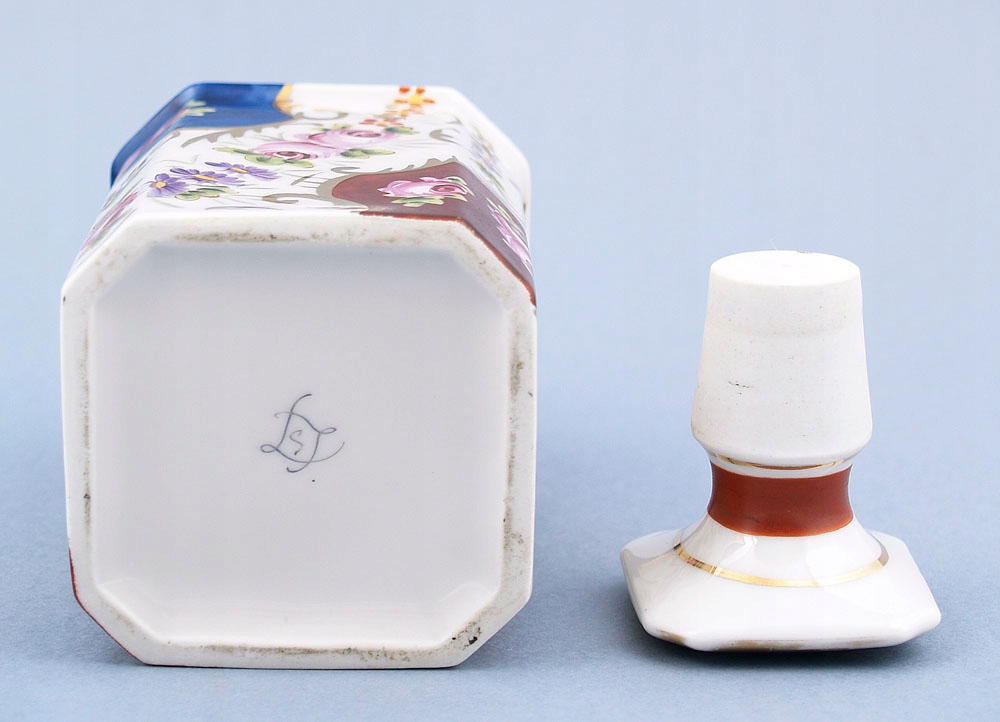 у формі прямокутної банки зі скошеними кутами, прикрашена розмальованими різнокольоровими квітами, по кутах на синьому та бордовому тлі , із золотою облямівкою. Коротка горловина, пофарбована золотом по краях і коміру, з прямокутною шапкою з циліндричною ніжкою. Підписано з нижньої сторони рокайльним візерунком з літерою "S" посередині. Порцеляна, Франція, надглазурні фарби, 20 століття.