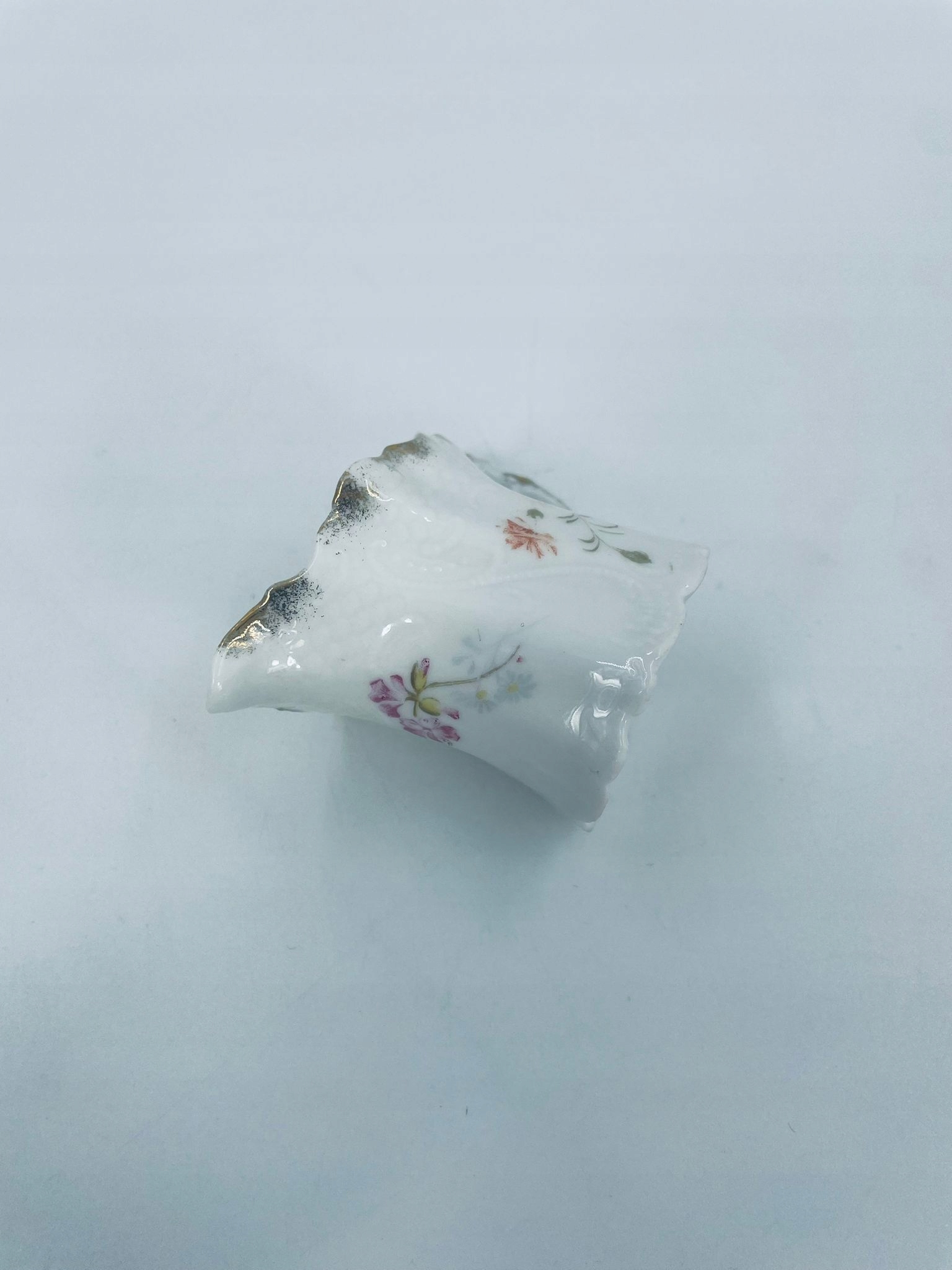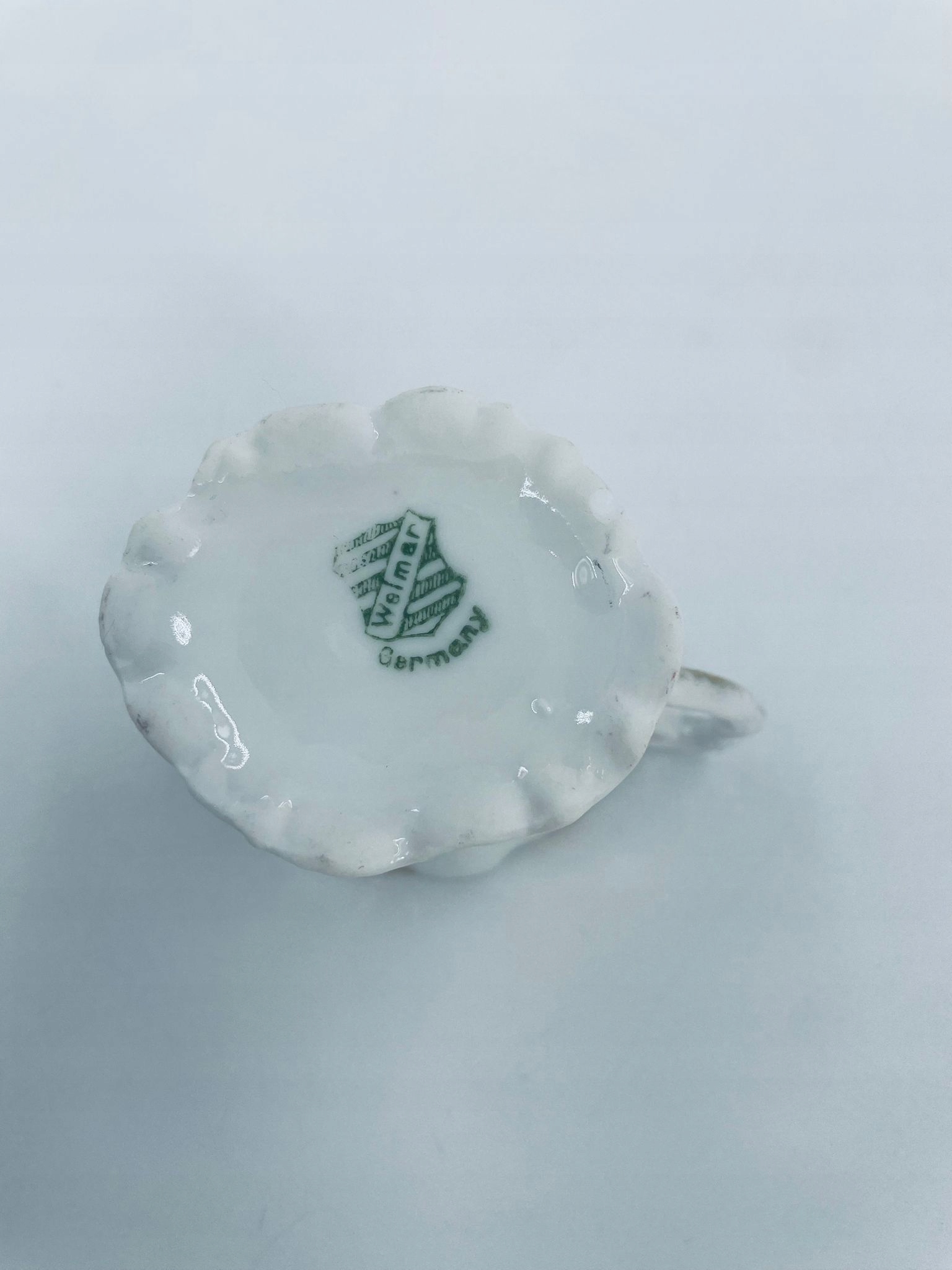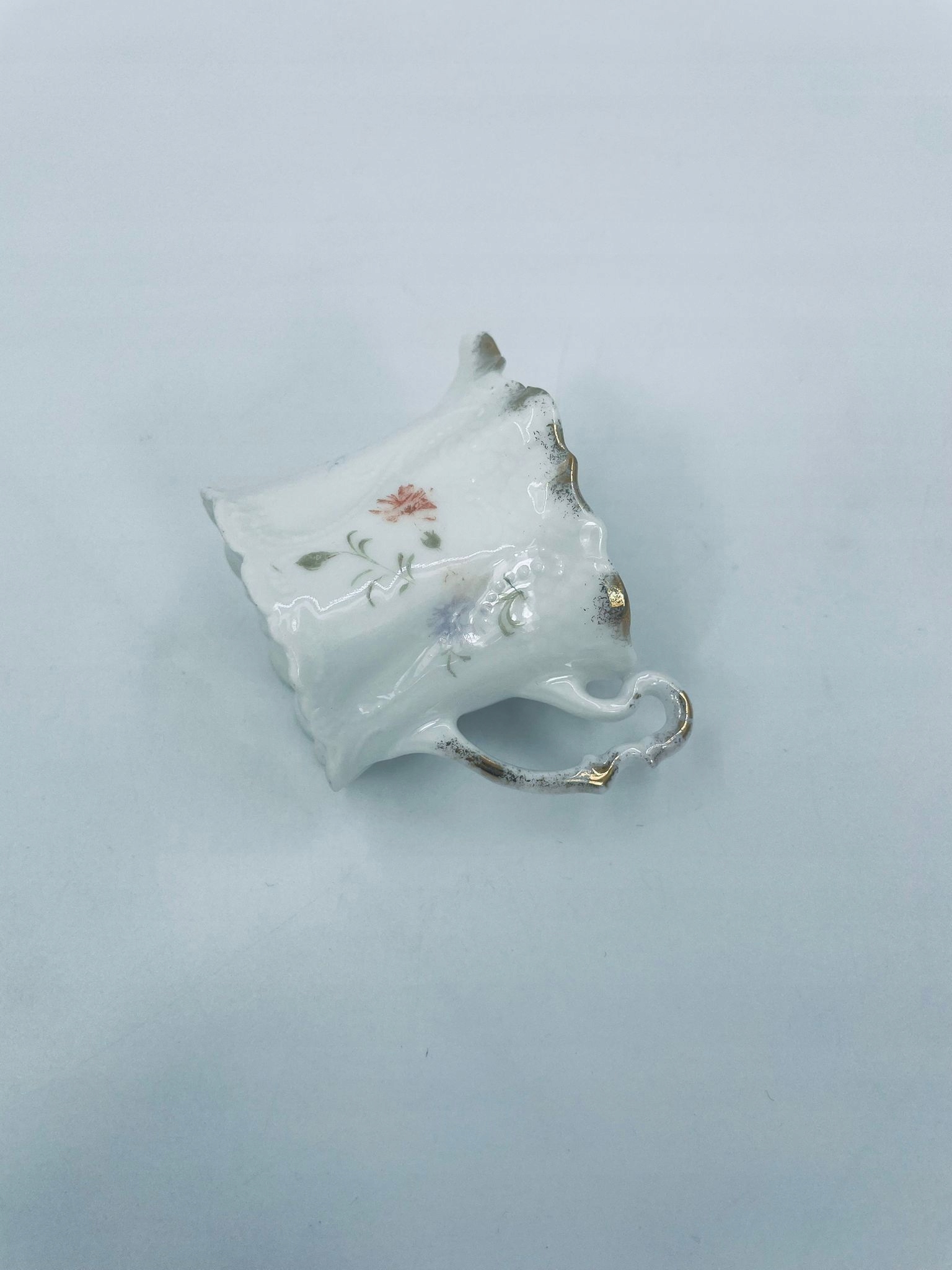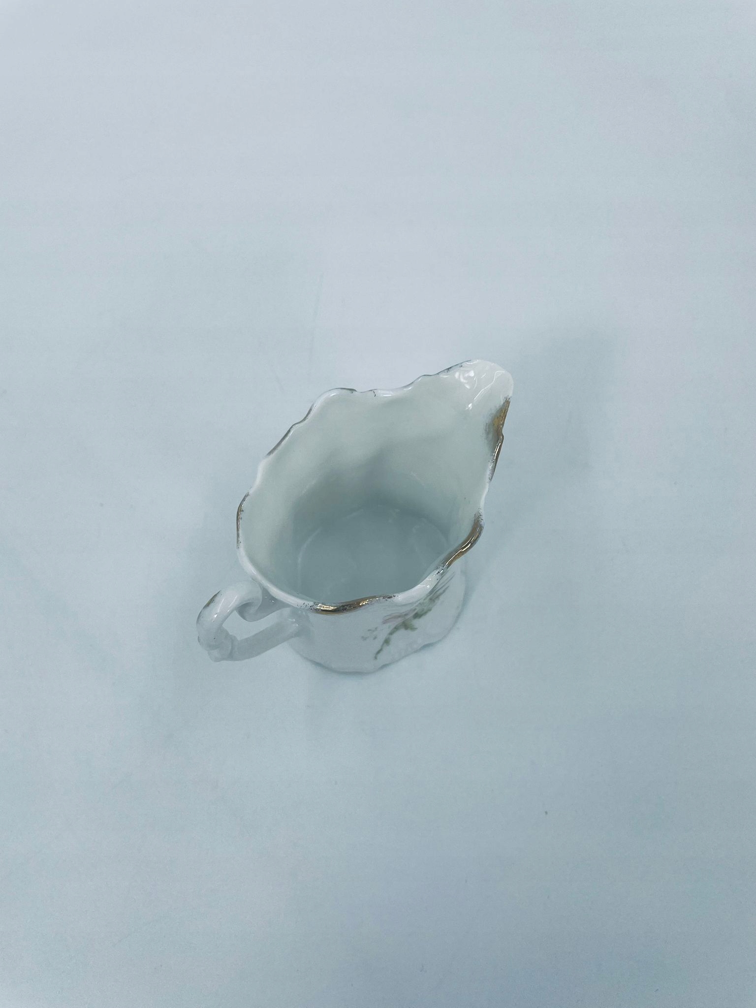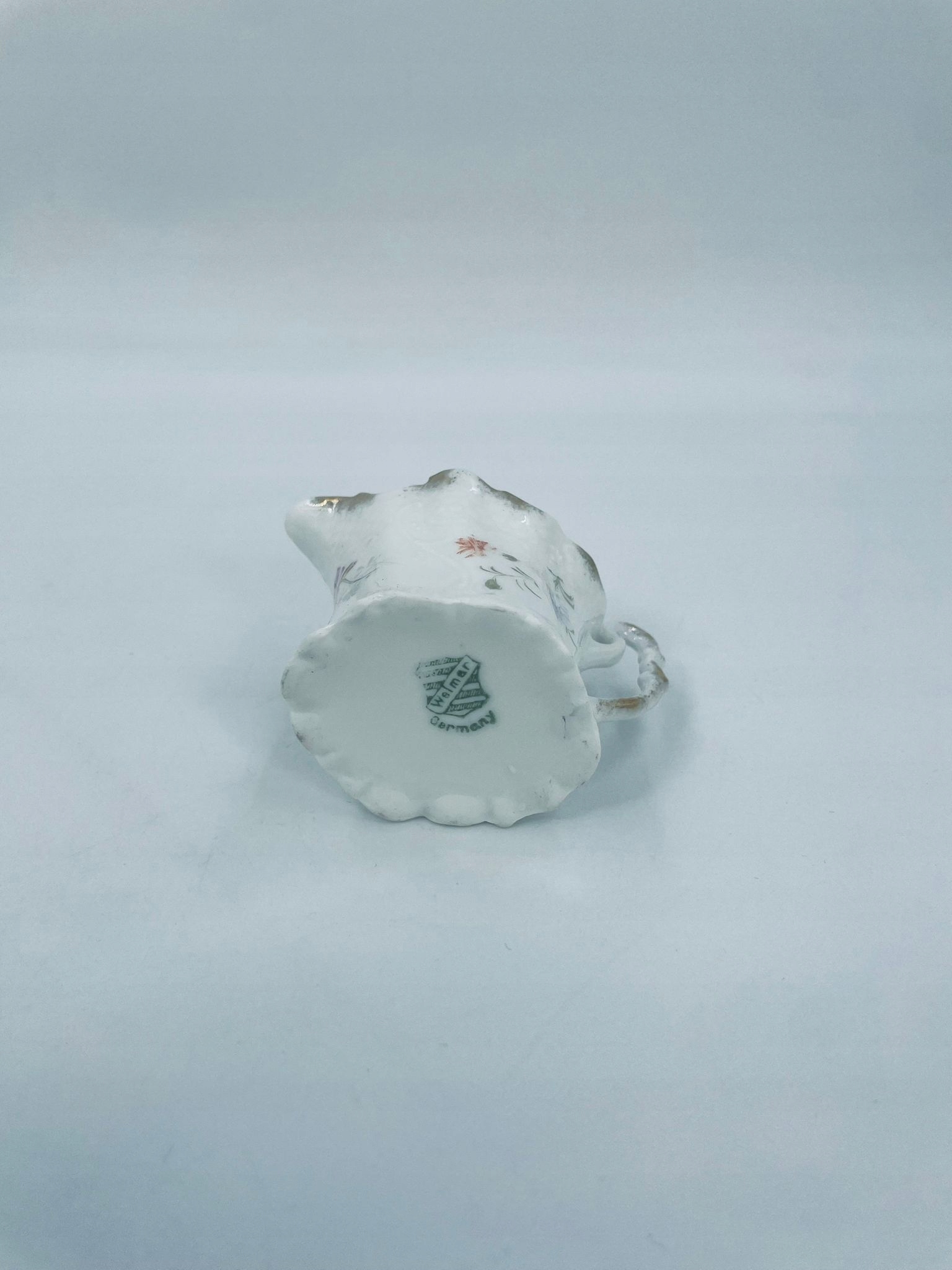 Маленький глечик для молока/вершків від Веймарської Німеччини, виготовлений із високоякісної білої порцеляни. Глечик із розписаними вручну квітковими візерунками, хвилястими краями із золотими вставками та рельєфами.