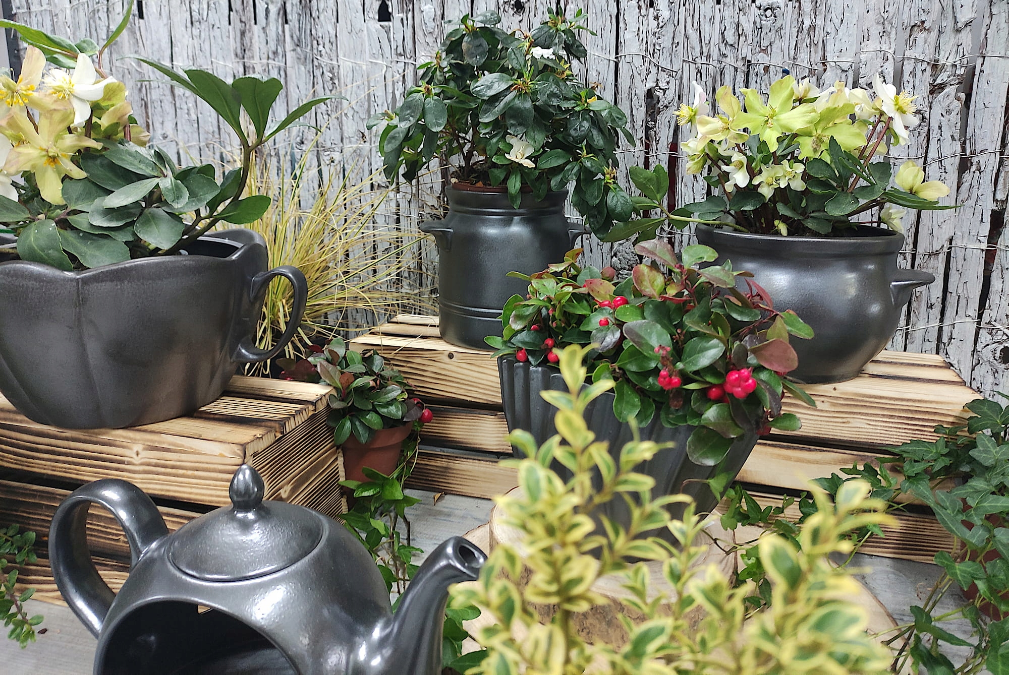 На кераміку нанесено графітове злегка блискуче покриття відповідно до сучасних тенденцій. Вироби досить важкі, тому їм не страшні ніякі вітри.
